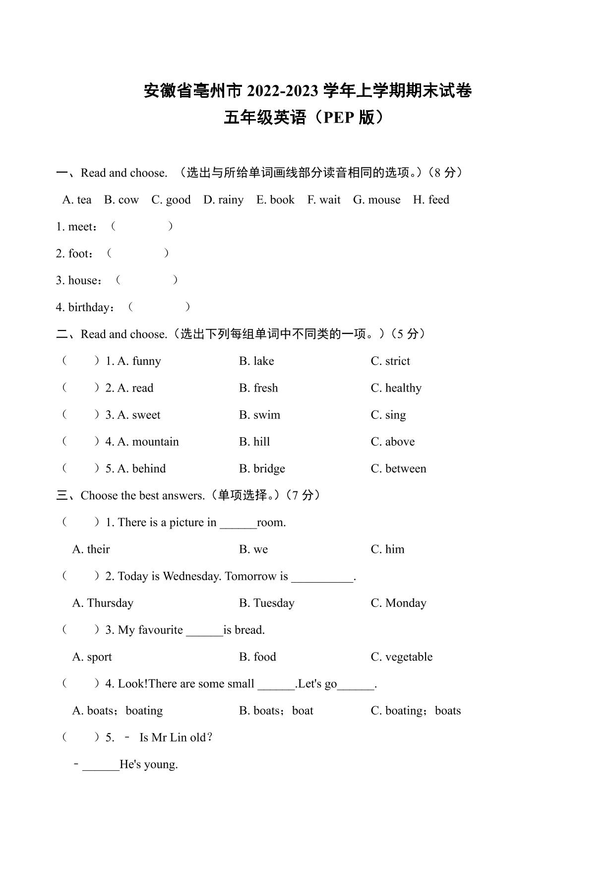 安徽省亳州市2022-2023学年上学期期末试卷五年级英语(PEP版)【无听力音频】