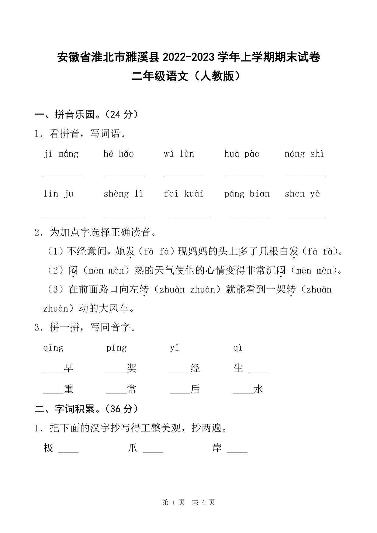 安徽省淮北市濉溪县2022-2023学年上学期期末试卷二年级语文(人教版)_R231101164306024