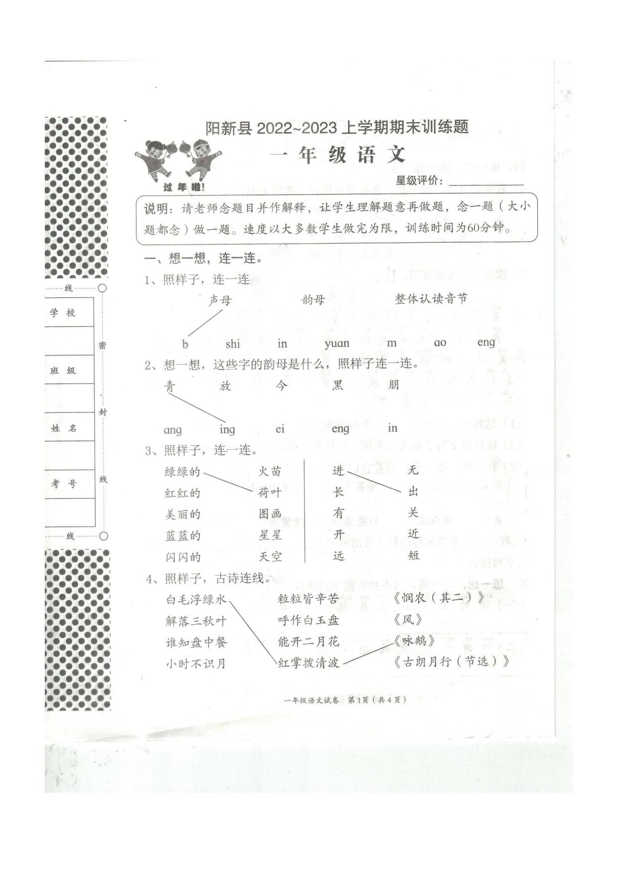 湖北省黄石市阳新县2022-2023学年上学期期末训练题一年级语文(人教版)