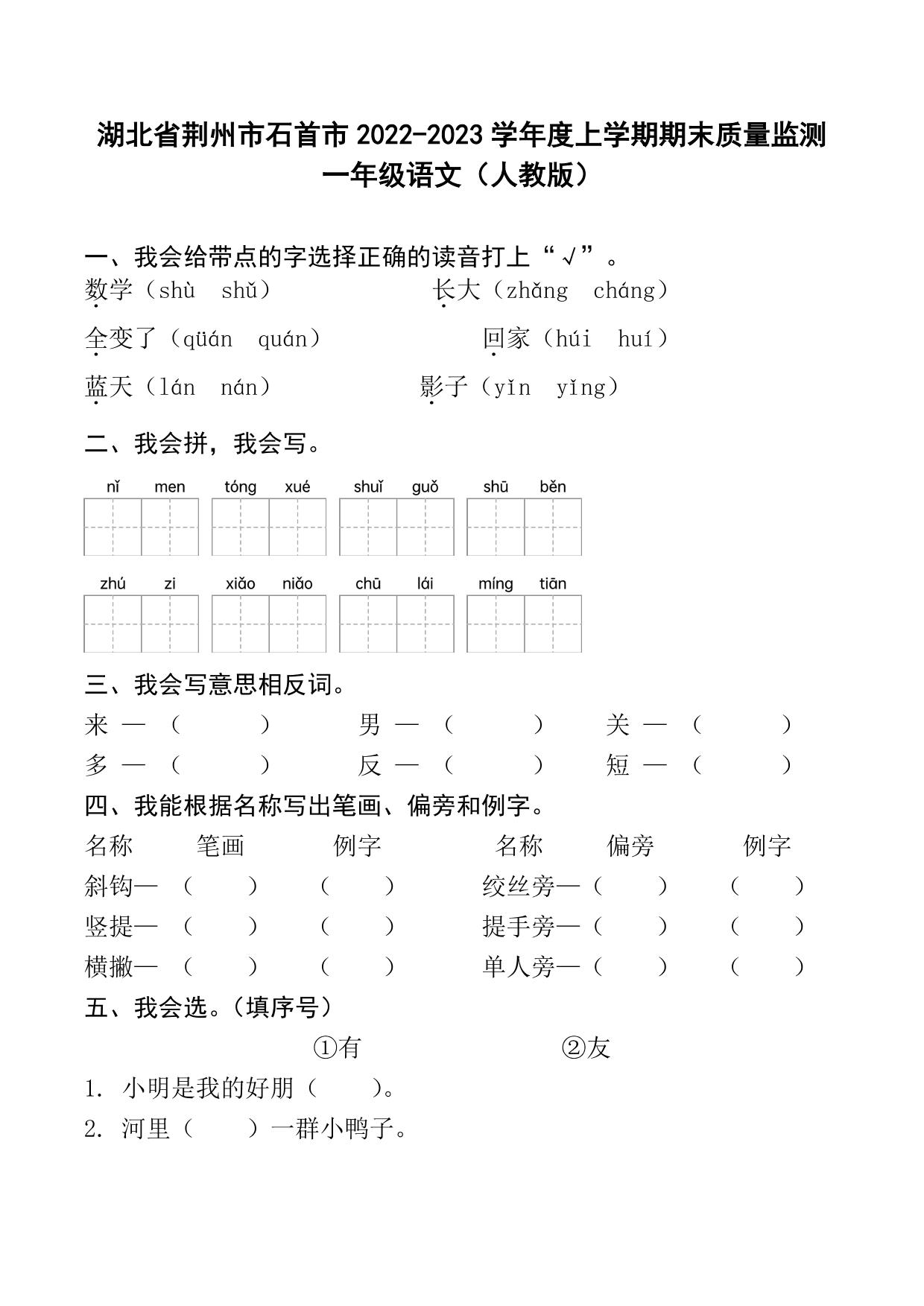 湖北省荆州市石首市2022-2023学年度上学期期末质量监测一年级语文(人教版)