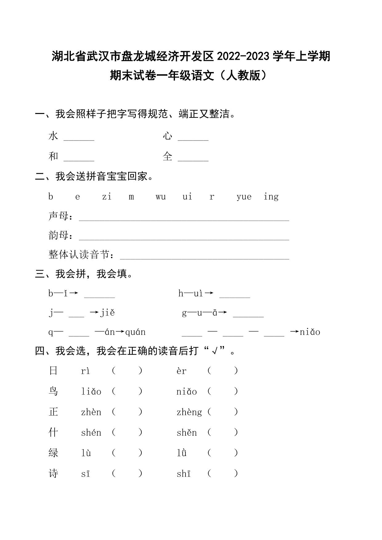 湖北省武汉市盘龙城经济开发区2022-2023学年上学期期末试卷一年级语文(人教版)