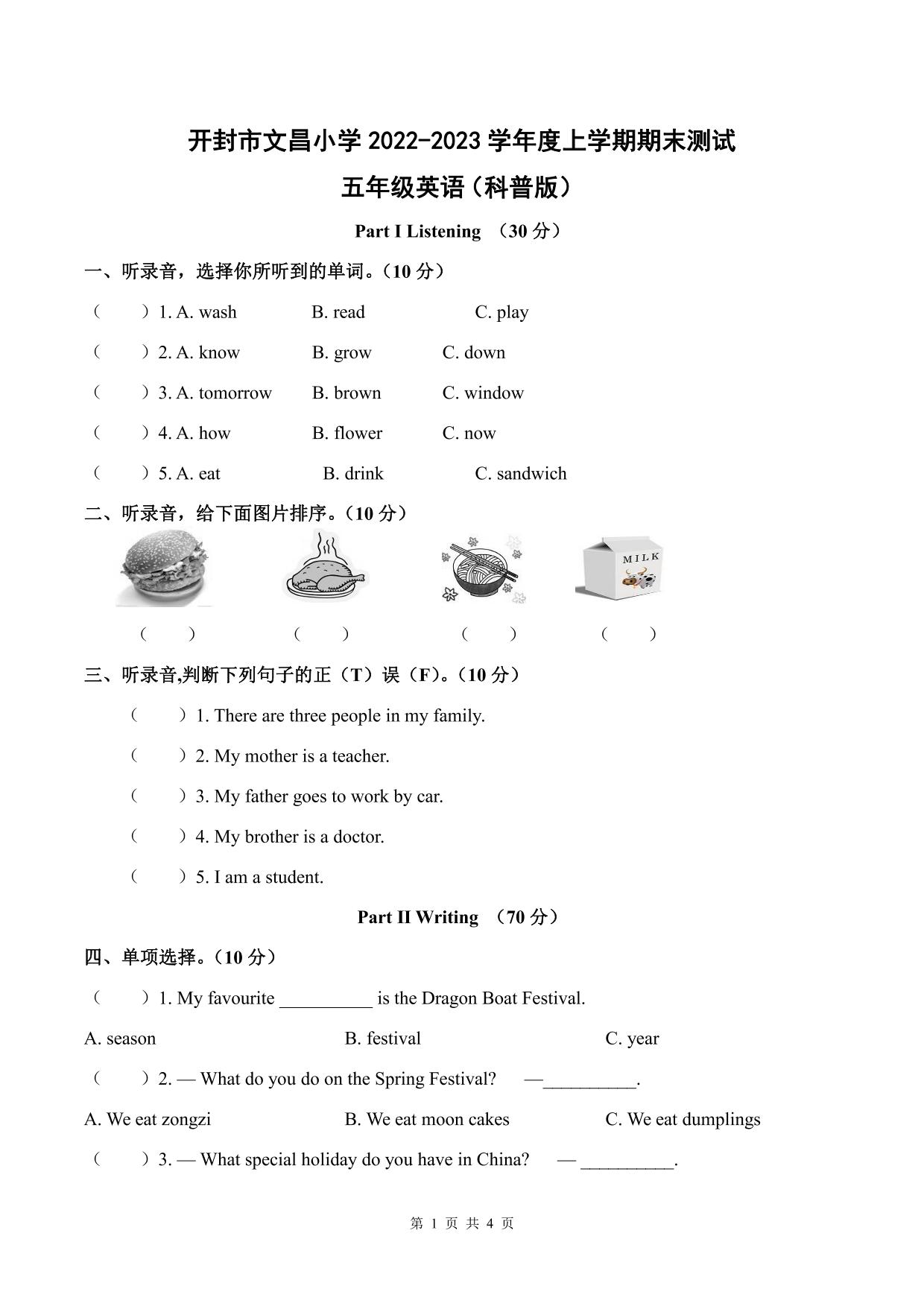 河南省开封市文昌小学2022-2023学年度上学期期末测试五年级英语(科普版)【无听力音频】