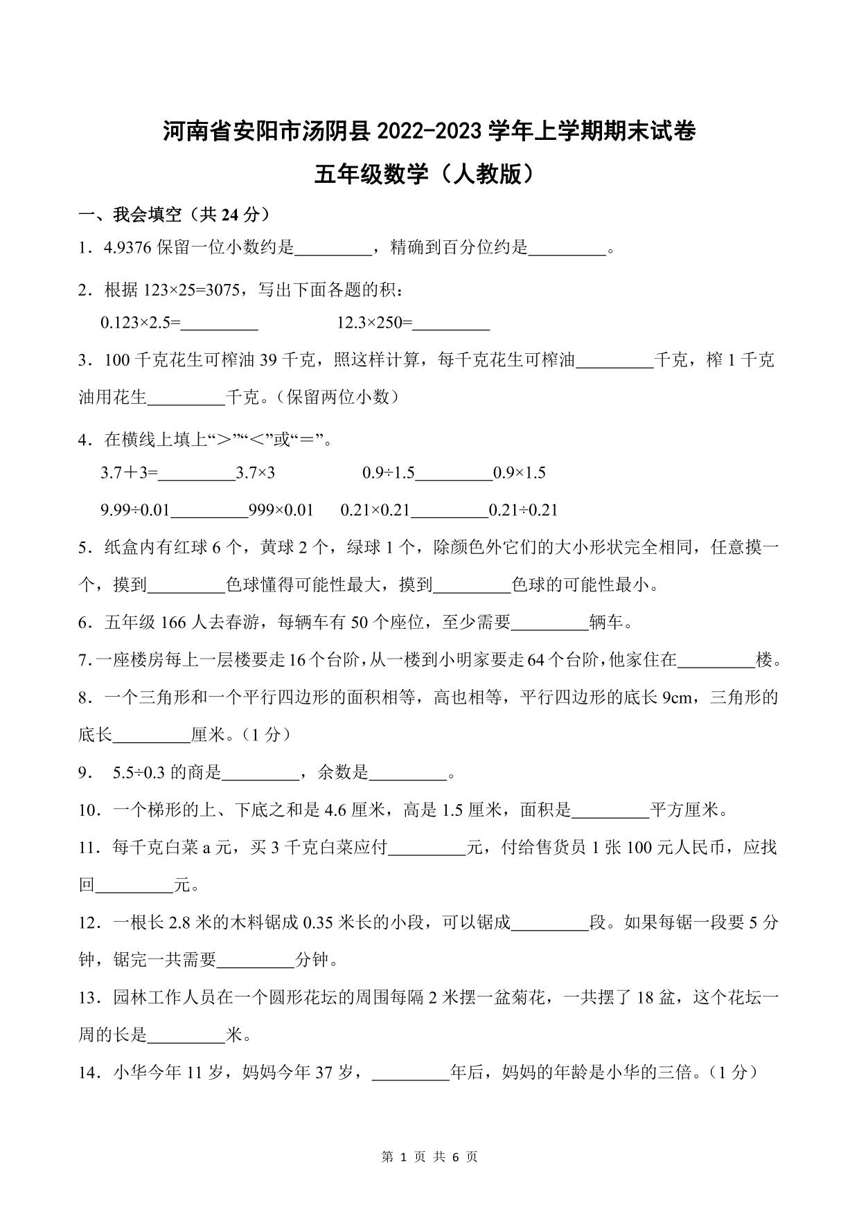 河南省安阳市汤阴县2022-2023学年上学期期末试卷五年级数学(人教版)