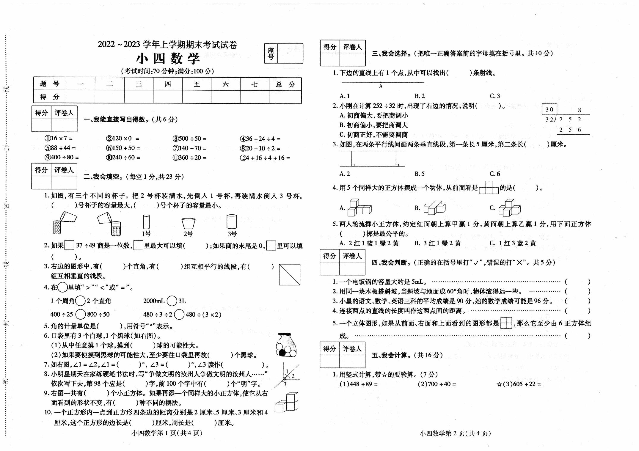 河南省平顶山市汝州市2022-2023学年上学期期末试卷四年级数学(苏教版)