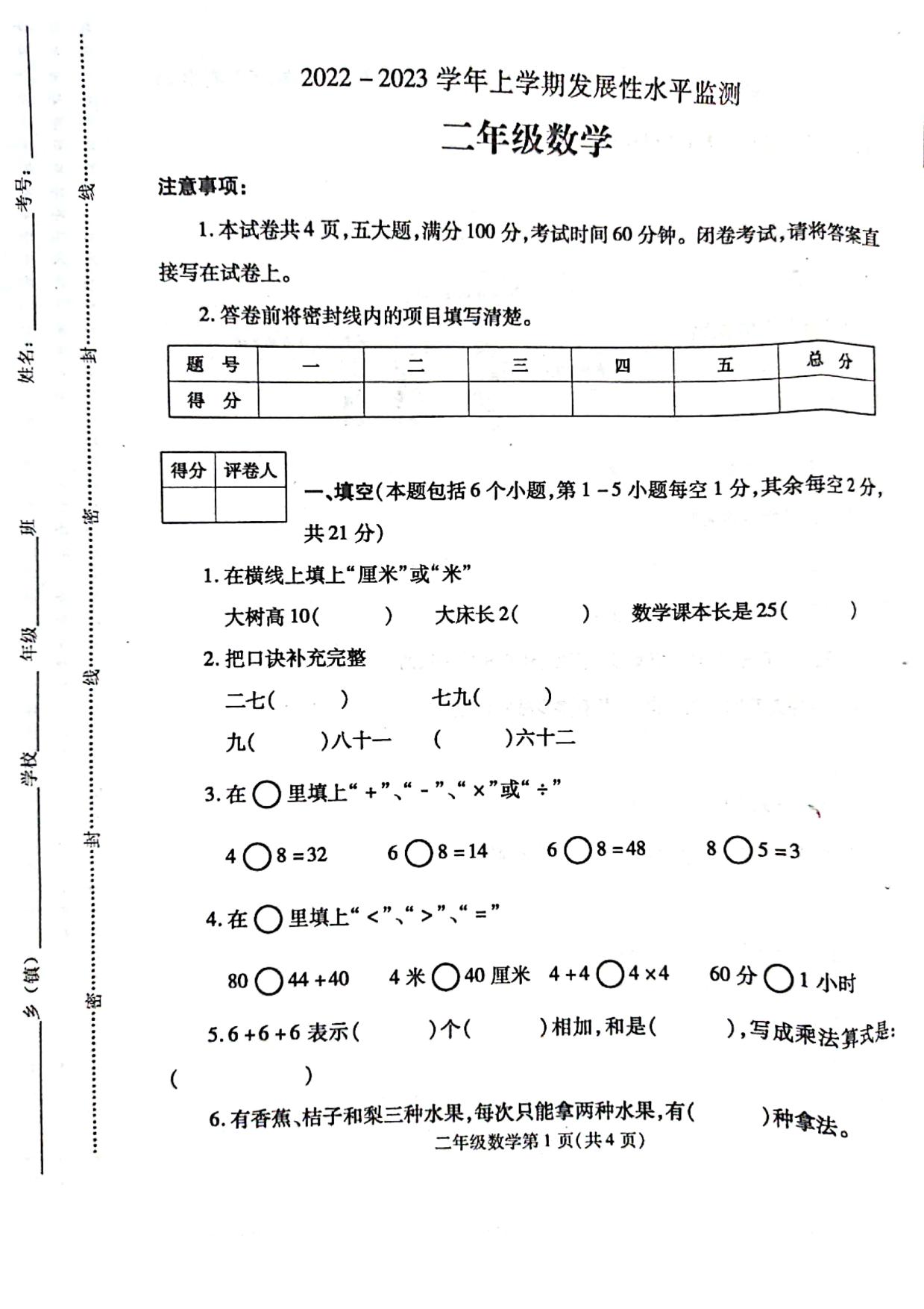二年级数学人教版上册期末卷