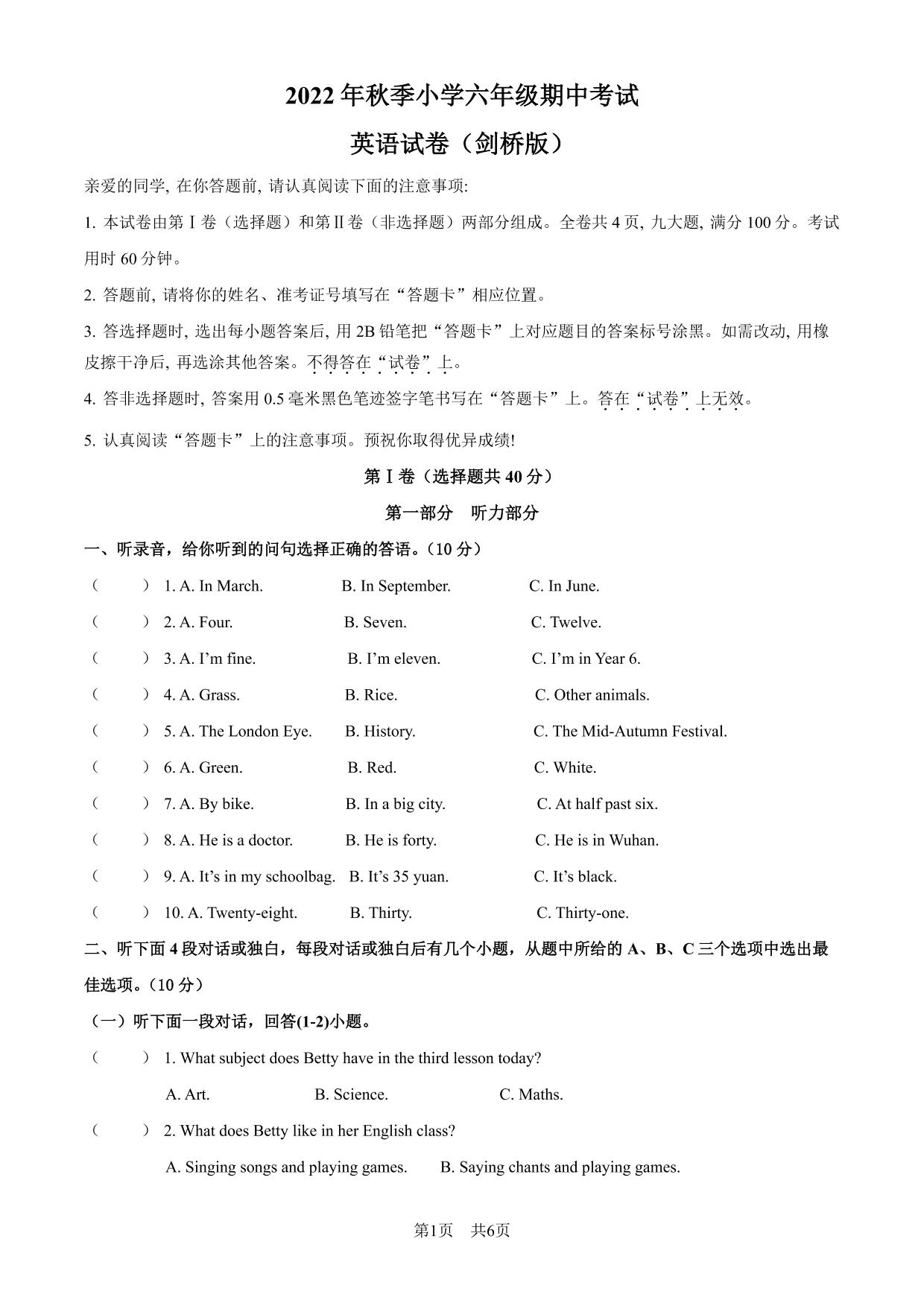 六年级英语剑桥版上册期中卷