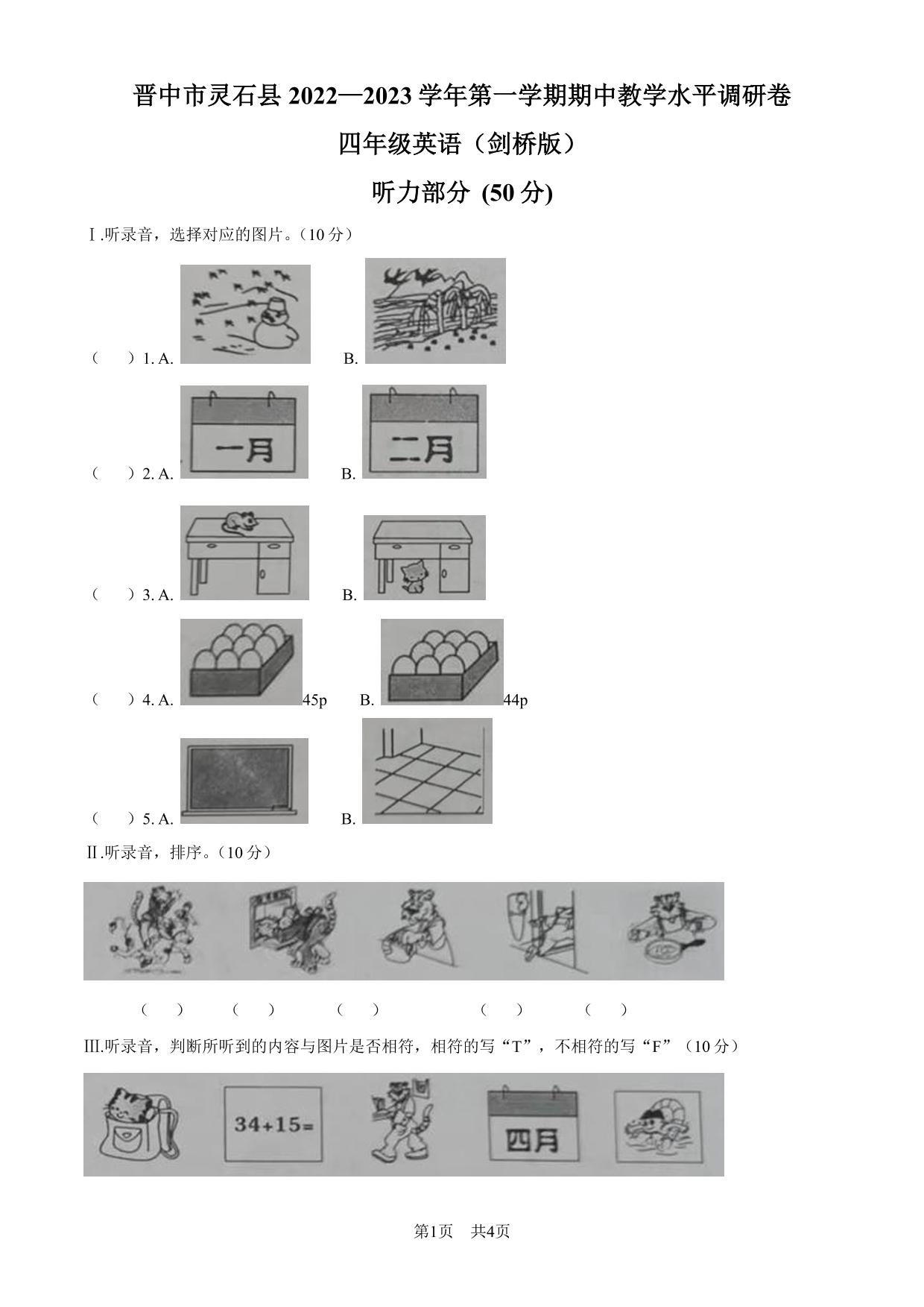 山西省晋中市灵石县2022-2023学年第一学期四年级英语期中教学水平调研卷(剑桥版)【无听力音频】