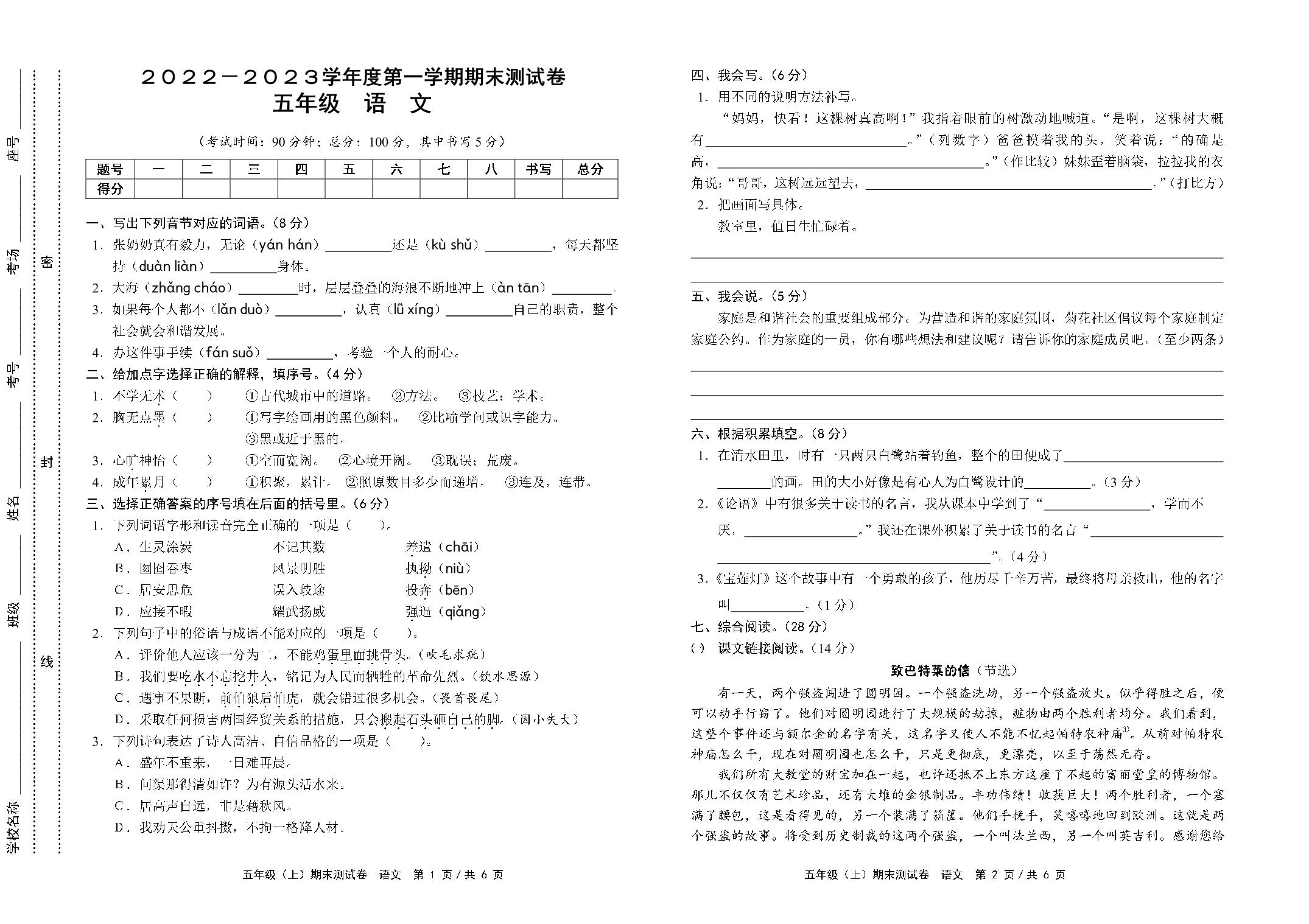 河南省商丘市永城市2022-2023学年上学期期末考试试题五年级语文(人教版)