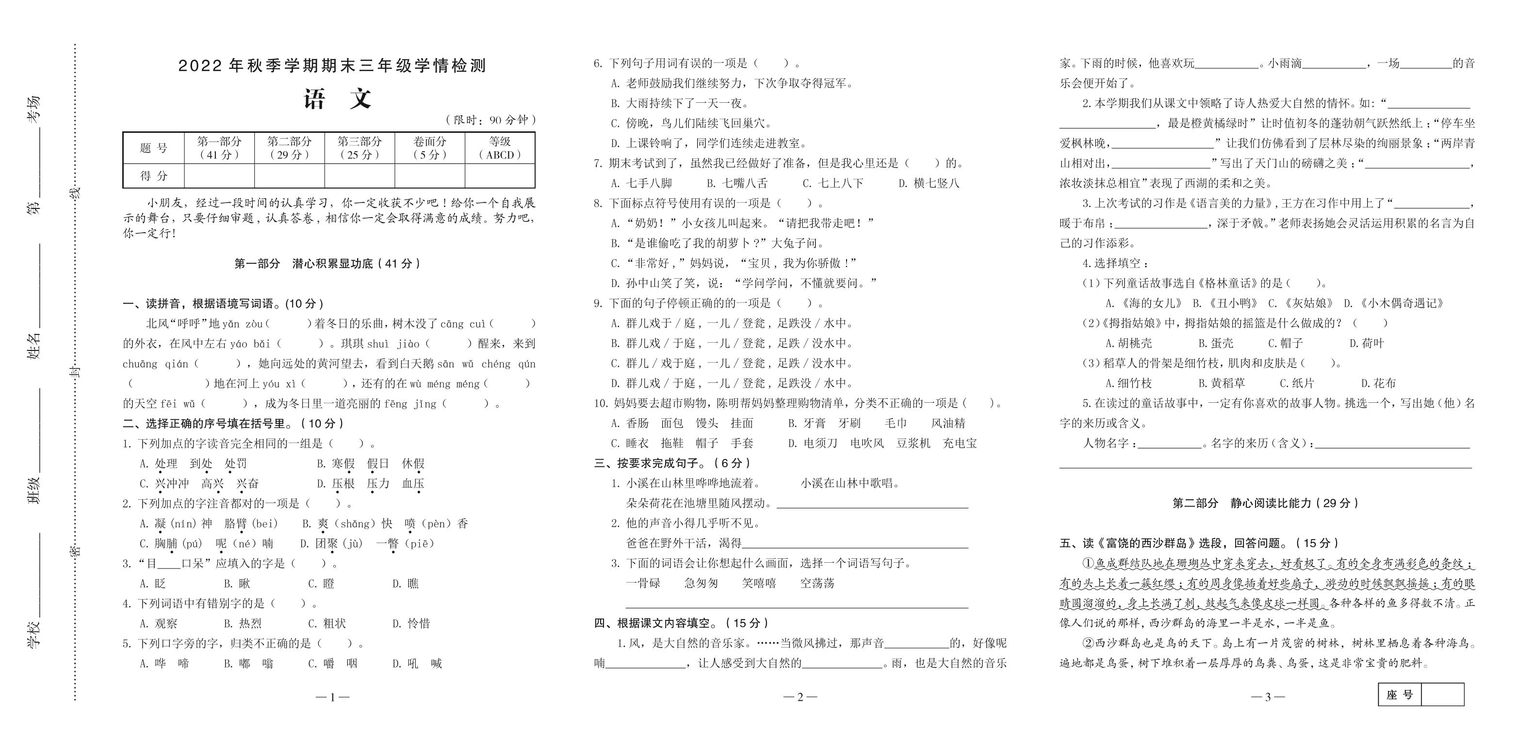 三年级语文人教版上册期末卷