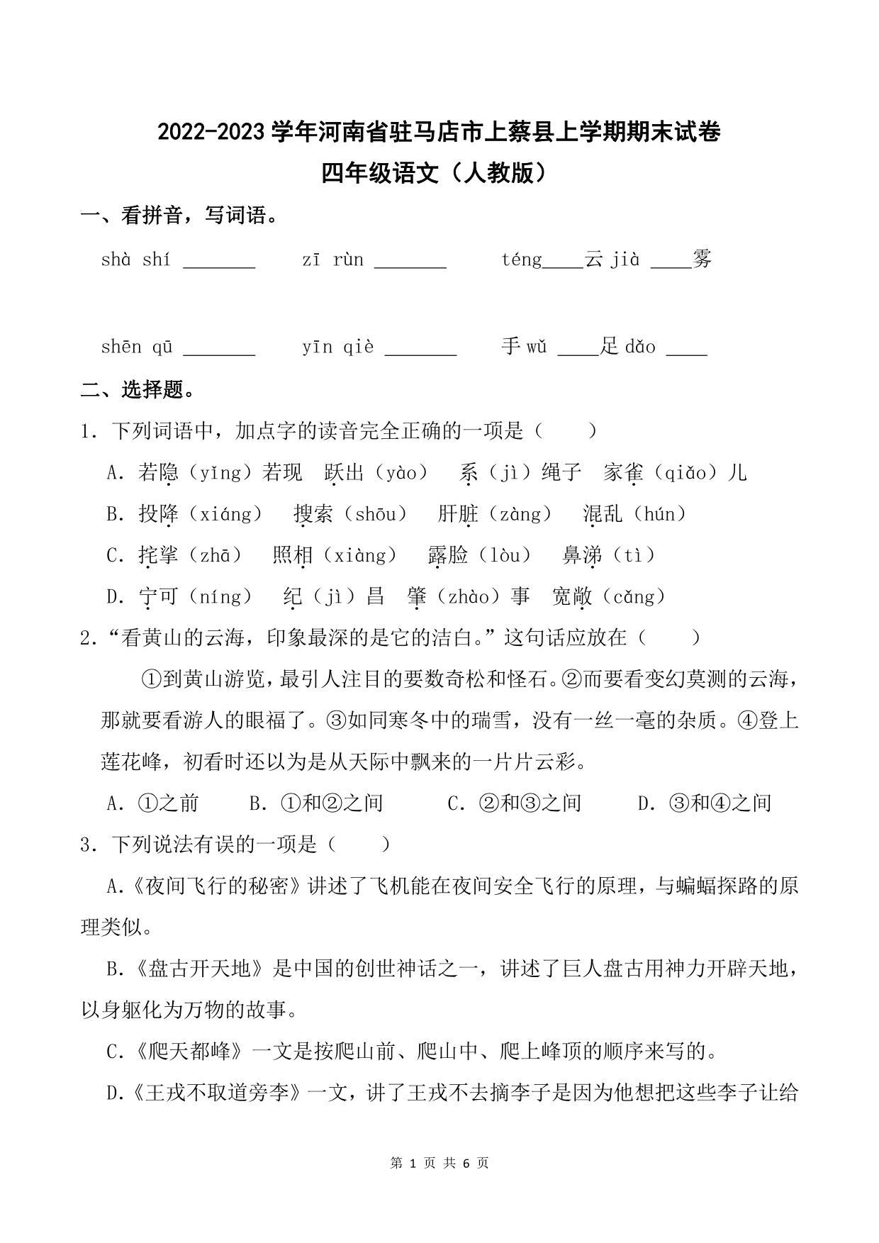 河南省驻马店市上蔡县2022-2023学年上学期期末试卷四年级语文(人教版)