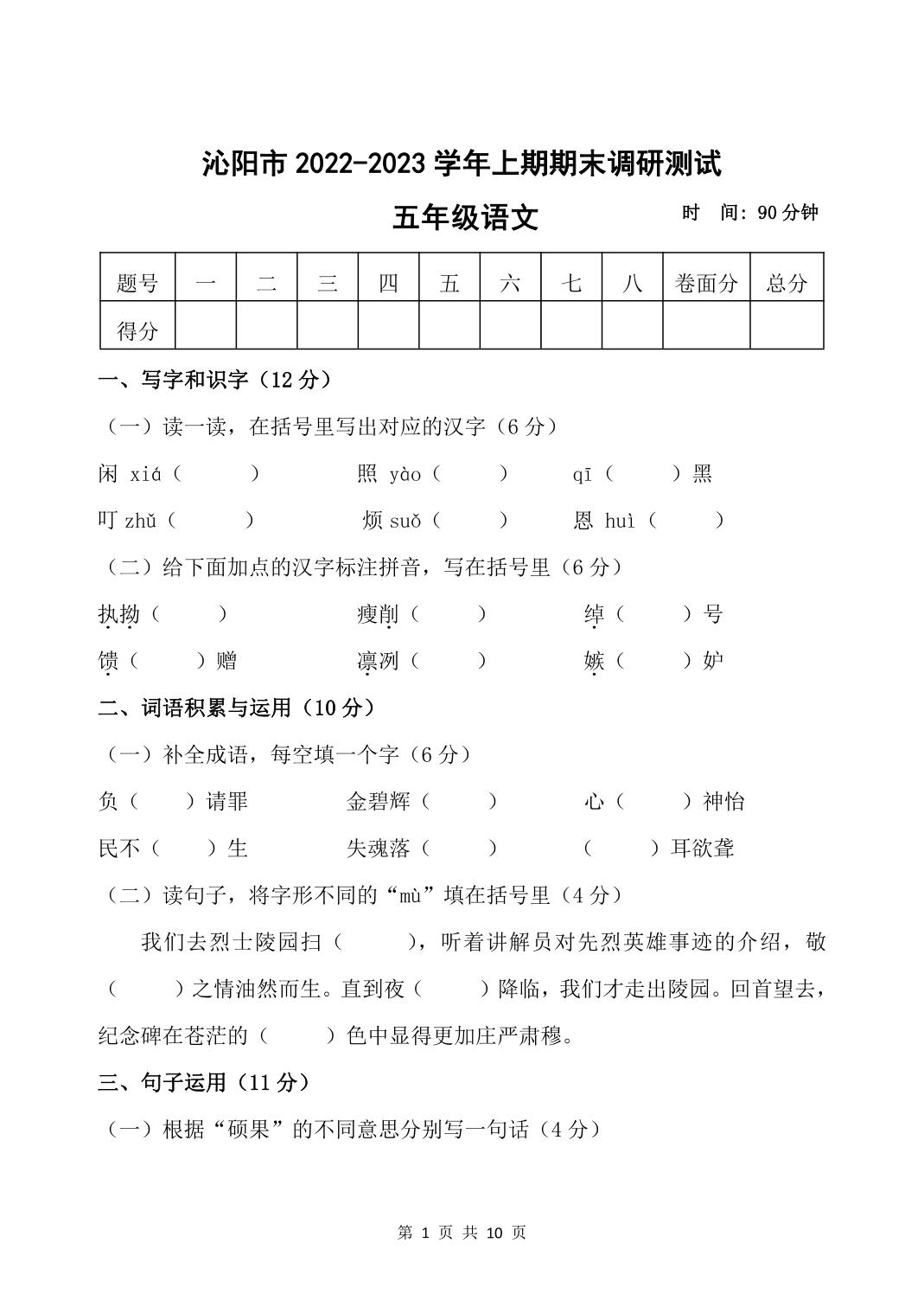 河南省焦作市沁阳市2022-2023学年上学期期末试题五年级语文(人教版)