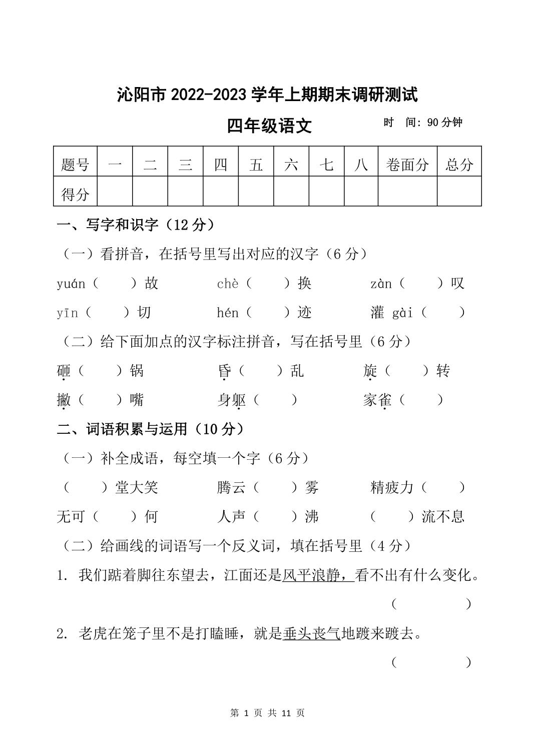 河南省焦作市沁阳市2022-2023学年上学期期末试题四年级语文(人教版)
