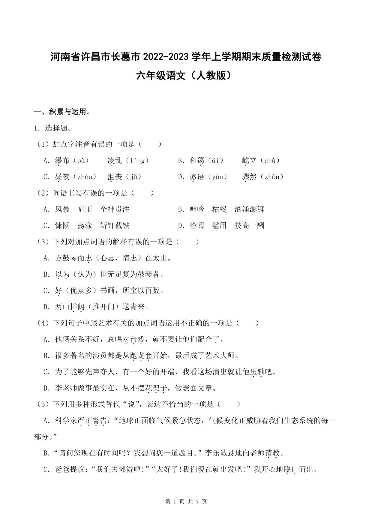河南省许昌市长葛市2022-2023学年上学期期末质量检测试卷六年级语文(人教版)