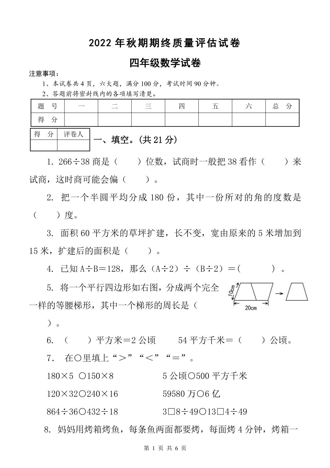 河南省南阳市淅川县2022-2023学年上学期期终质量评估试题四年级数学(人教版)