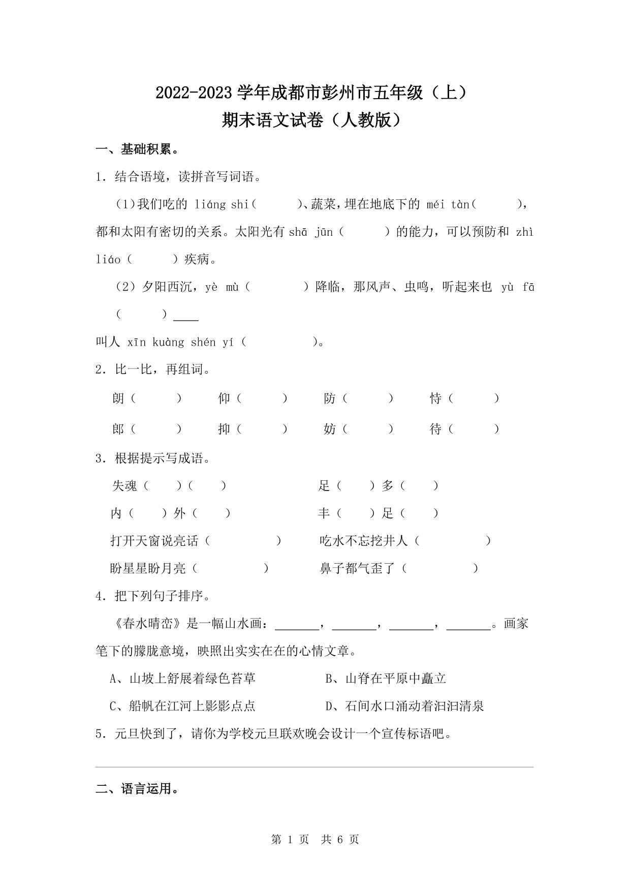 四川省成都市彭州市2022-2023学年第一学期五年级期末语文试卷(人教版)
