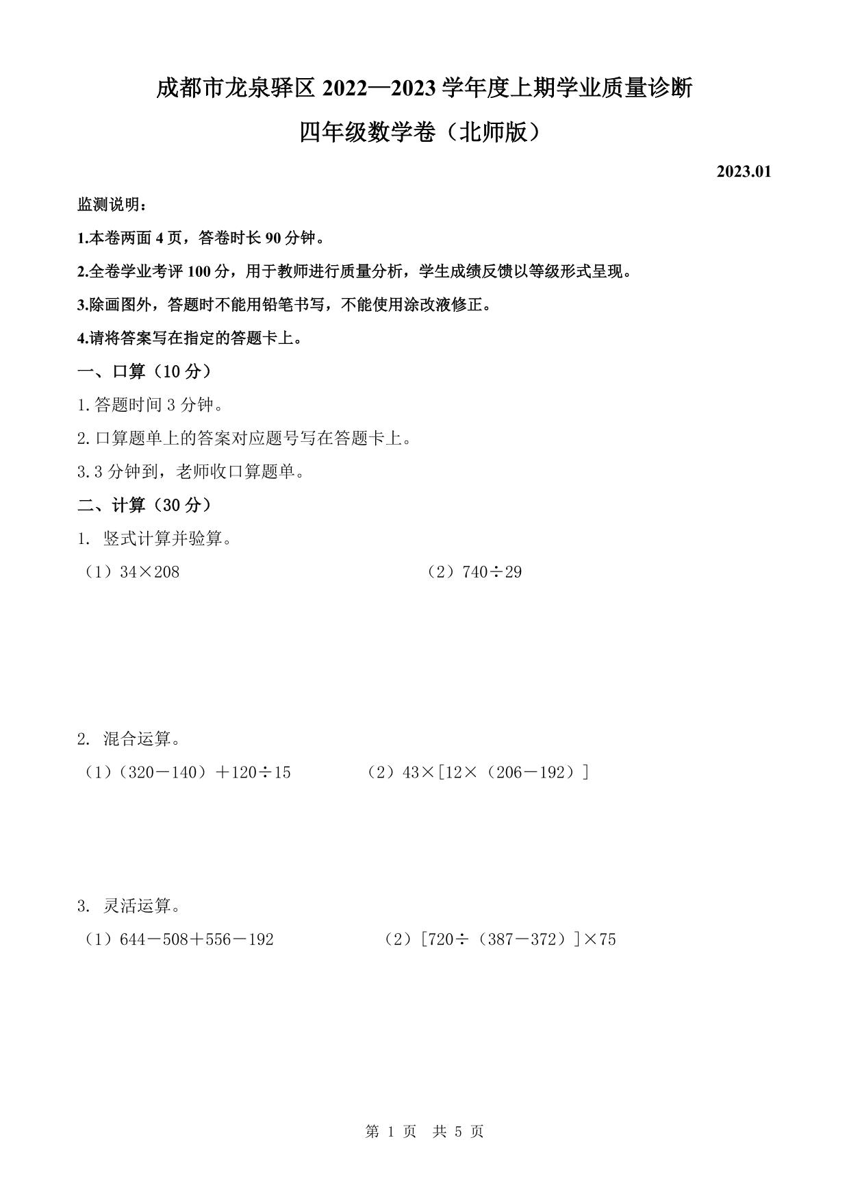 四川省成都市龙泉驿区2022-2023学年第一学期四年级期末考试数学试卷(北师版)