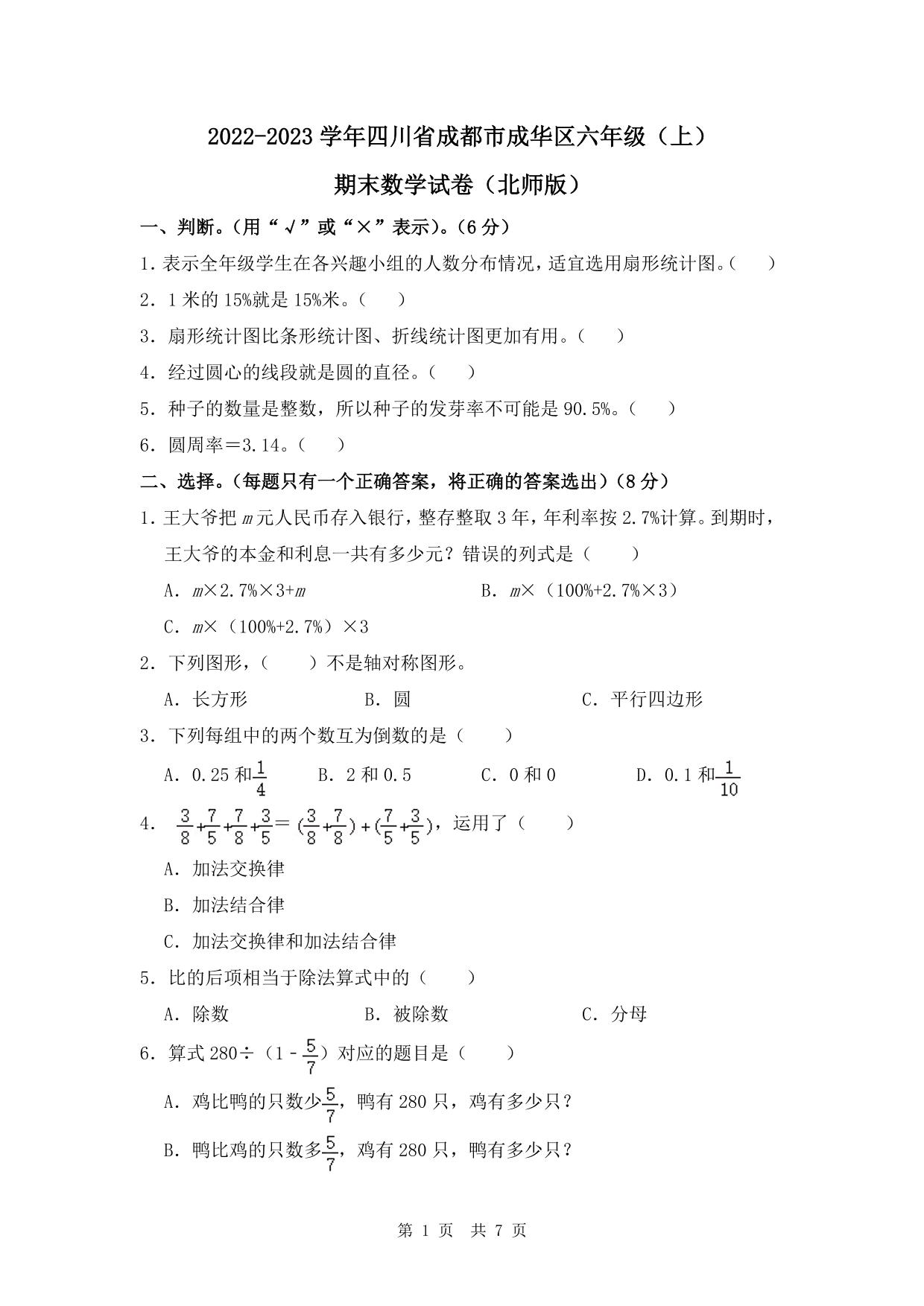 四川省成都市成华区2022-2023学年第一学期六年级期末数学试卷(北师版)
