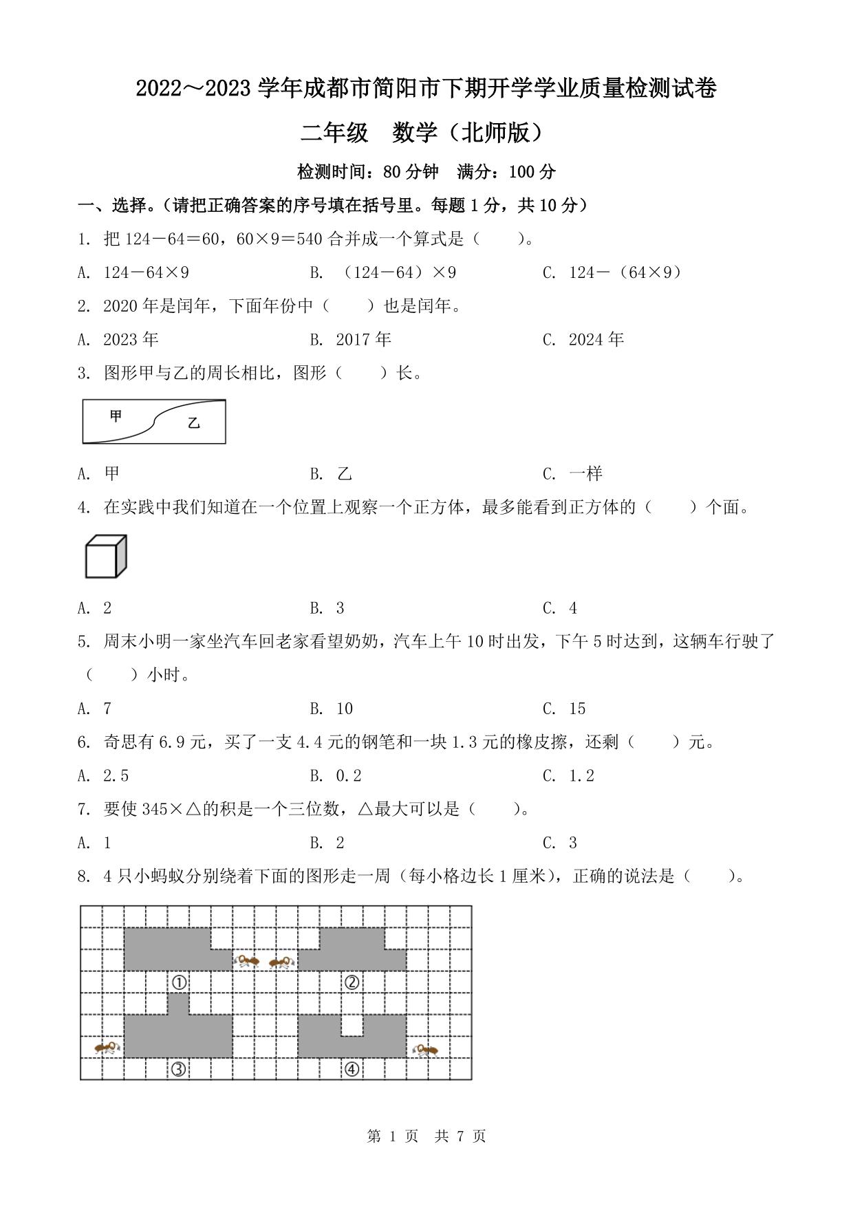 四川省成都市简阳市2022-2023学年第一学期三年级期末考试数学试卷(北师版)