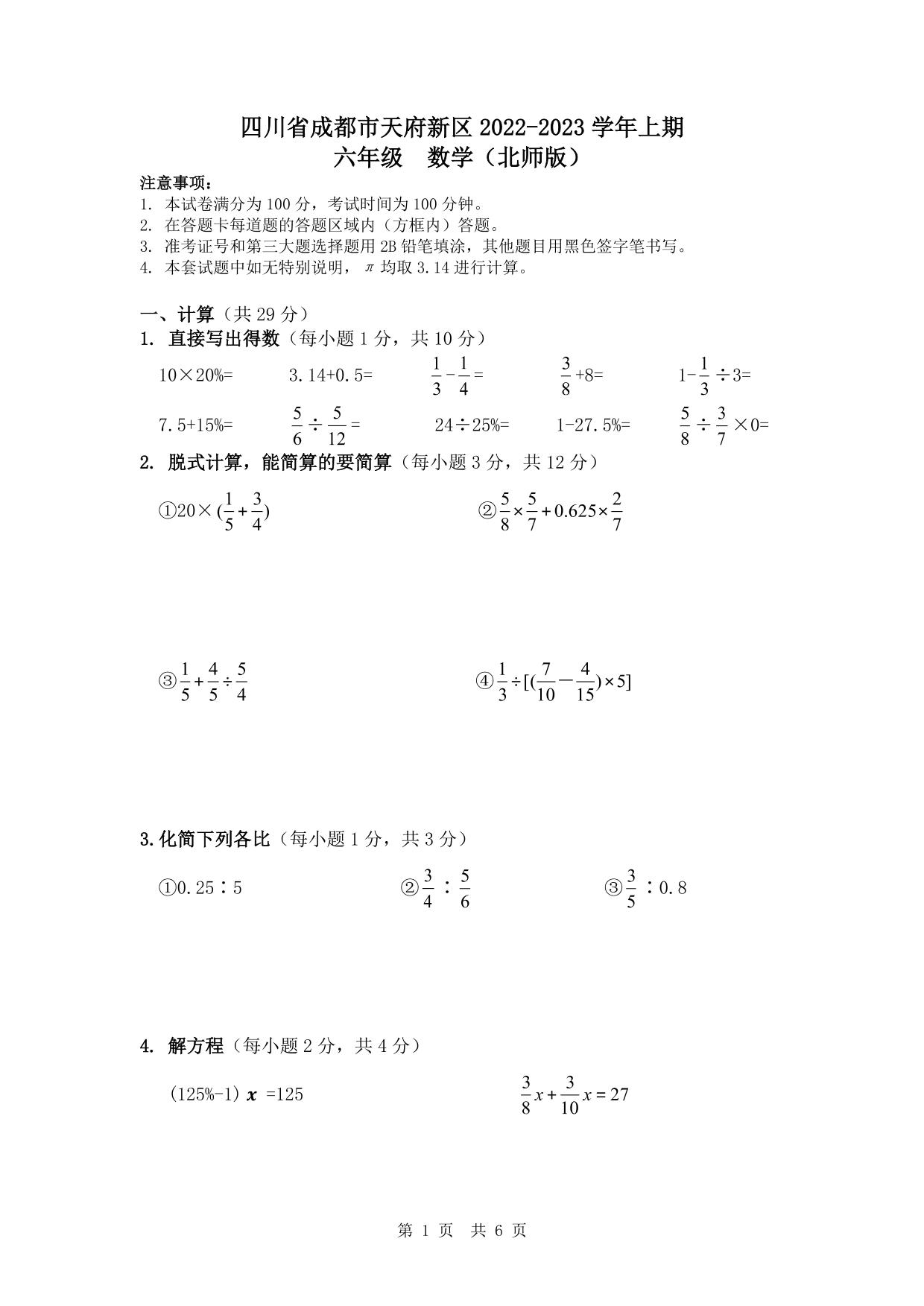 四川省成都市天府新区2022-2023学年第一学期六年级期末数学试题(北师版)