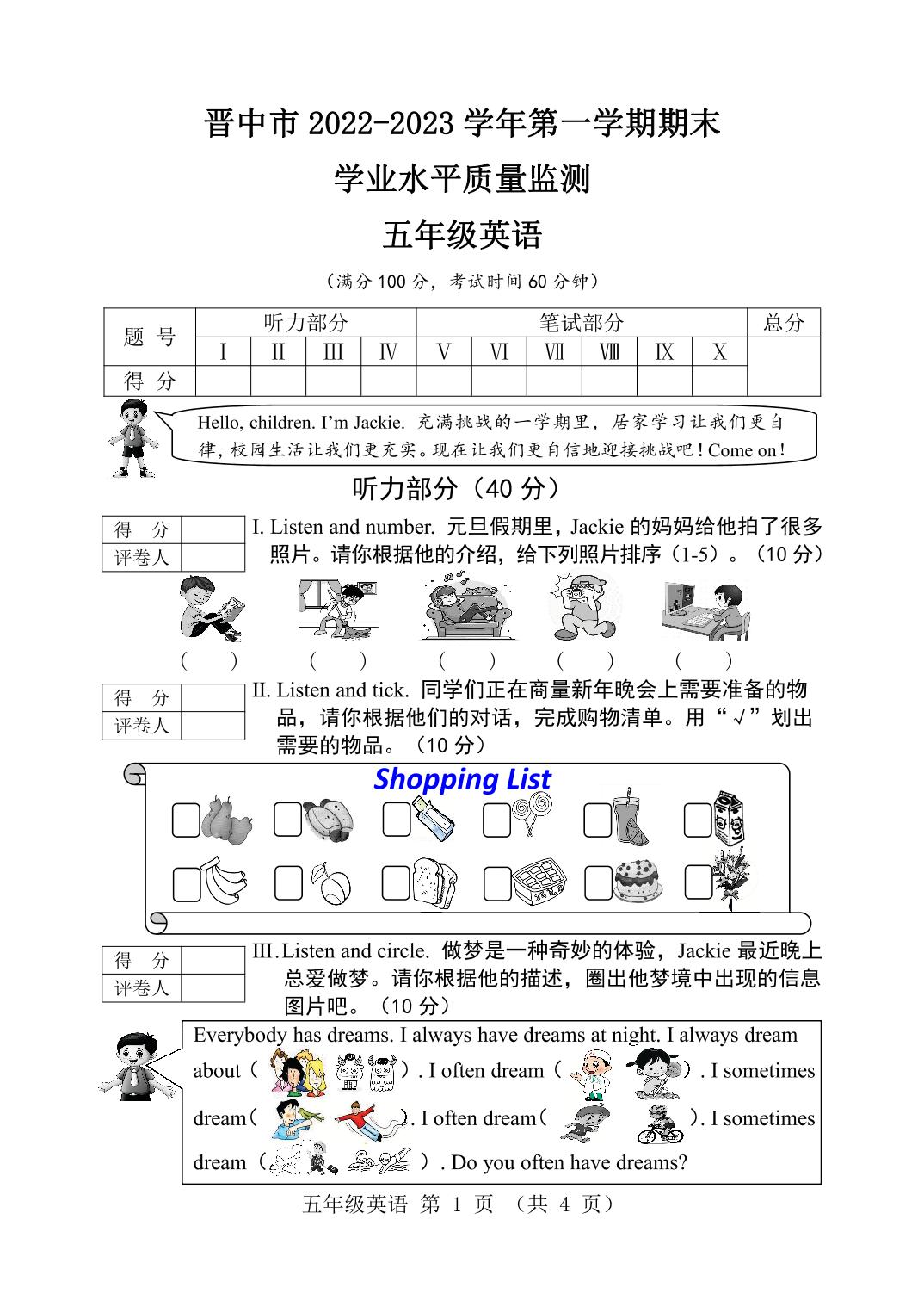 山西省晋中市2022-2023学年第一学期五年级期末学业水平质量监测英语试题(剑桥版)【无听力音频】