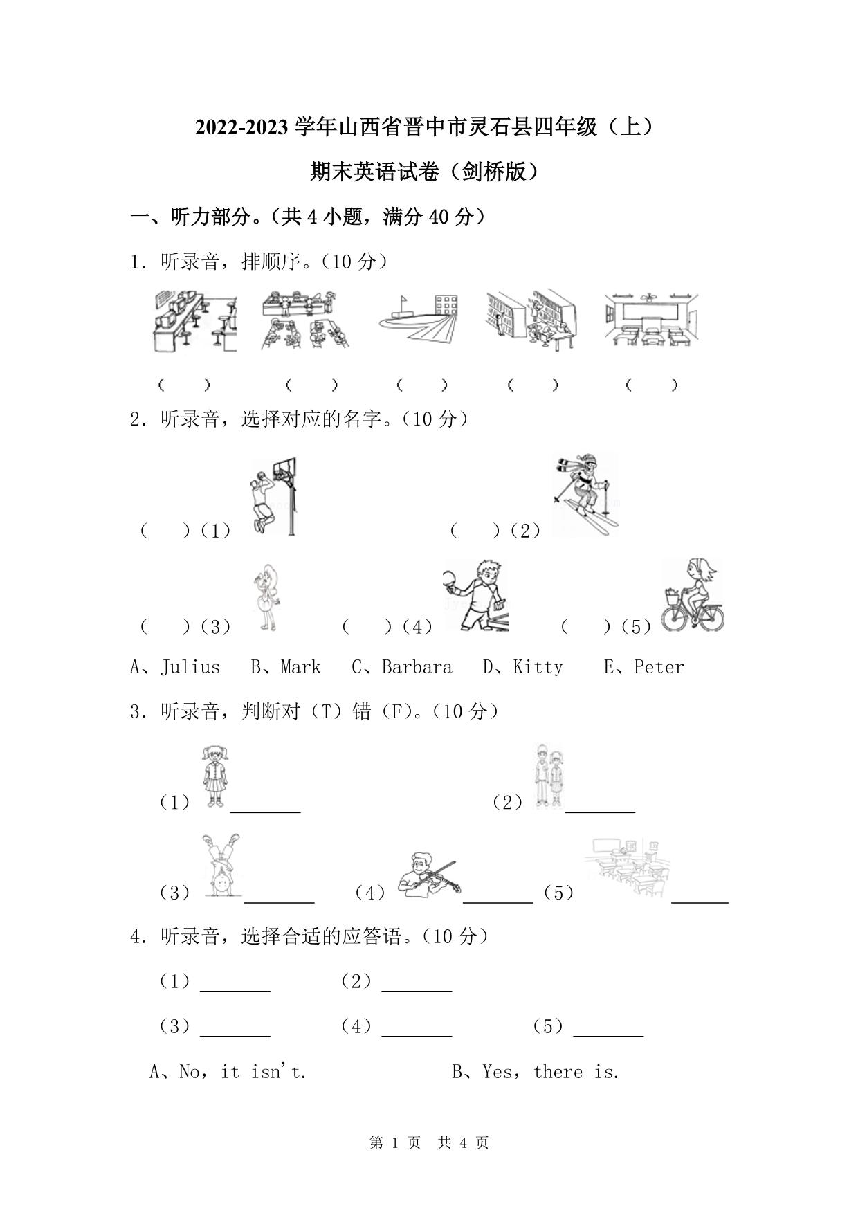 山西省晋中市灵石县2022-2023学年第一学期四年级期末英语试卷(剑桥版)【无听力音频】
