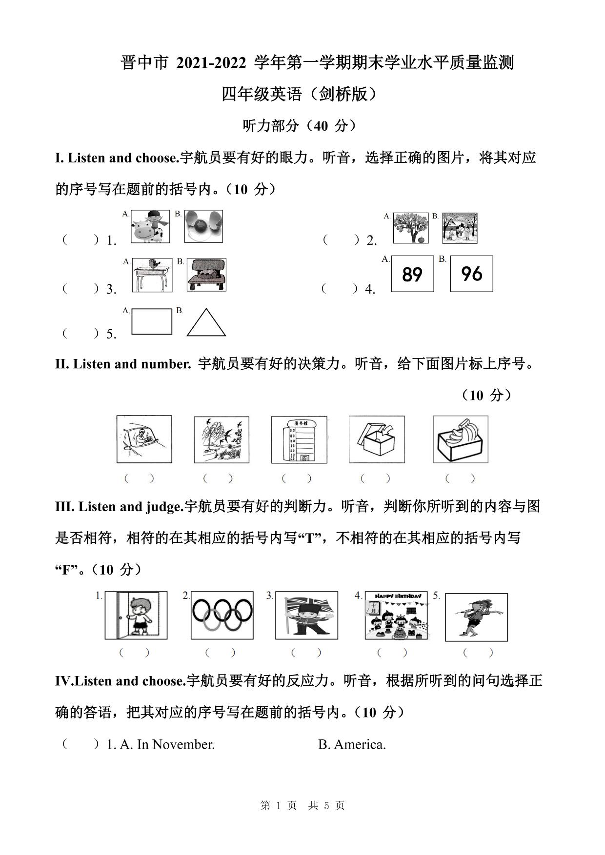 山西省晋中市2021-2022学年第一学期四年级期末学业水平质量监测英语试卷(剑桥版)【无听力音频】