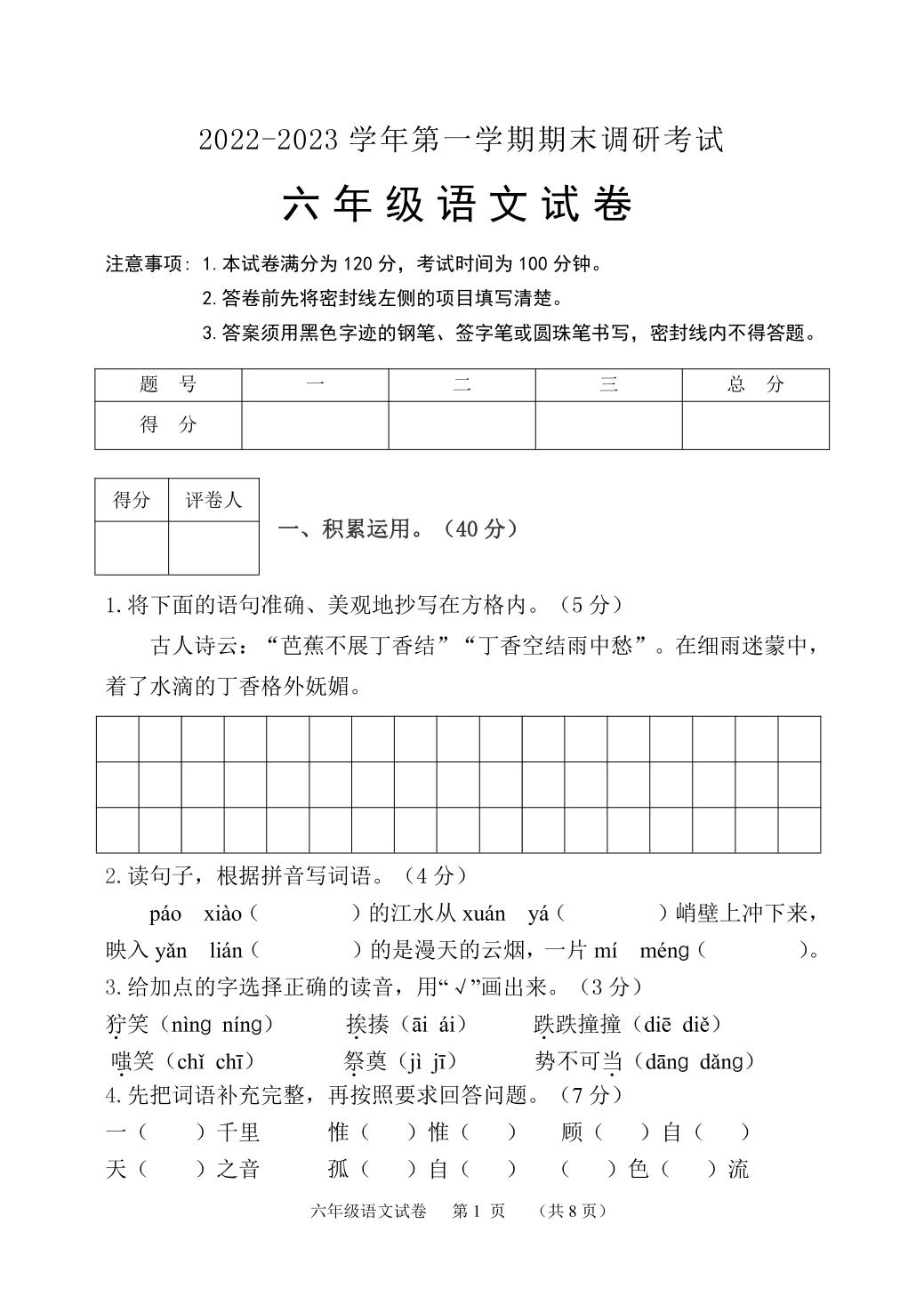 河北省保定市唐县2022-2023学年第一学期期末调研考试六年级语文(人教版)