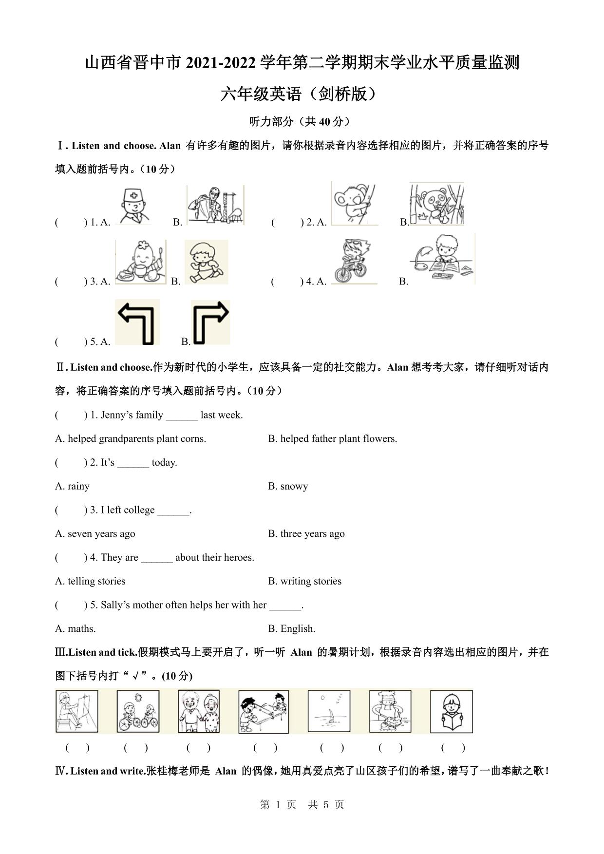 山西省晋中市2021-2022学年第二学期期末学业水平质量监测六年级英语试卷(剑桥版)【无听力音频】