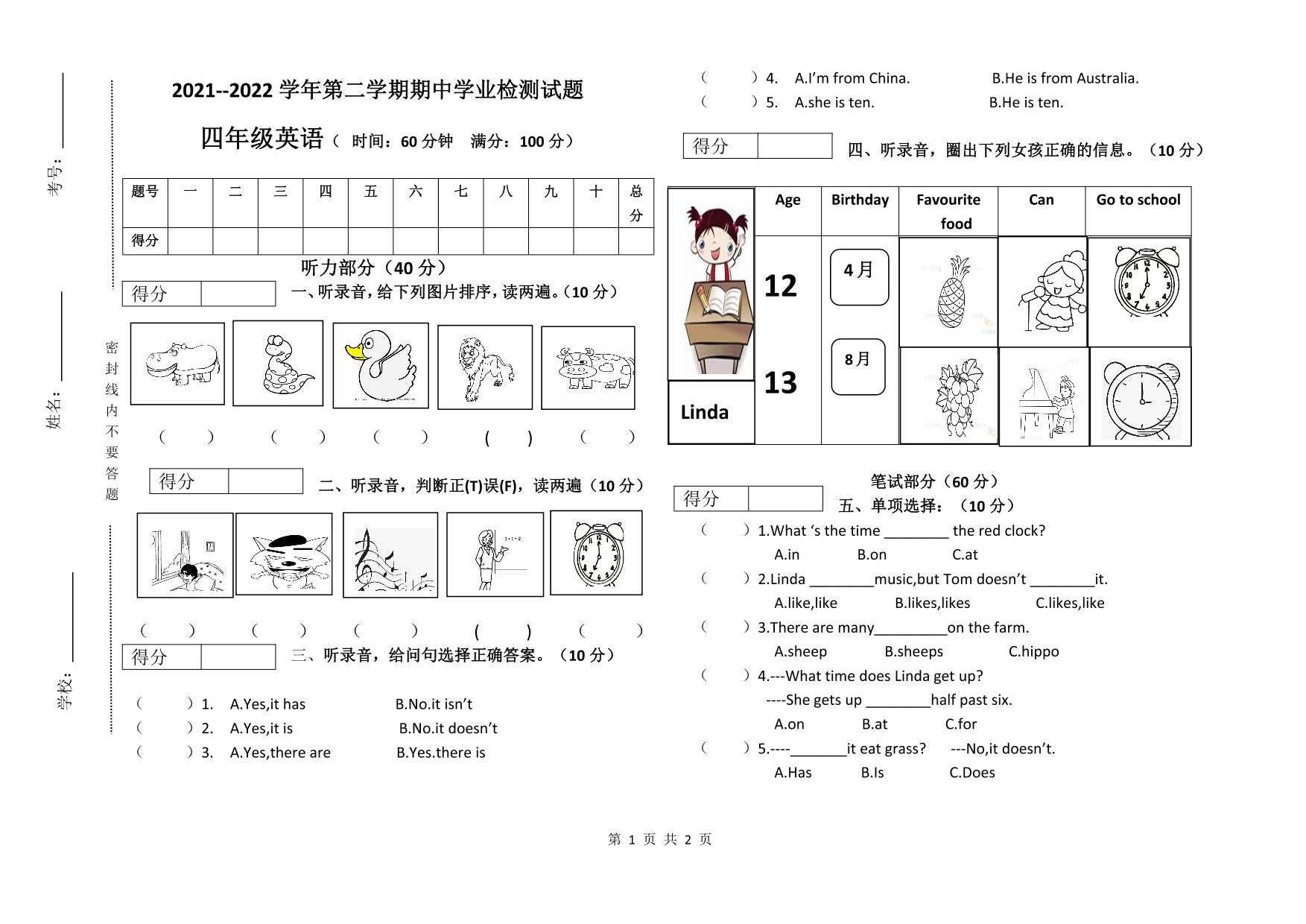 山西省晋中市地区2021-2022学年第二学期四年级期中学业检测英语试题(剑桥版)【无听力音频】
