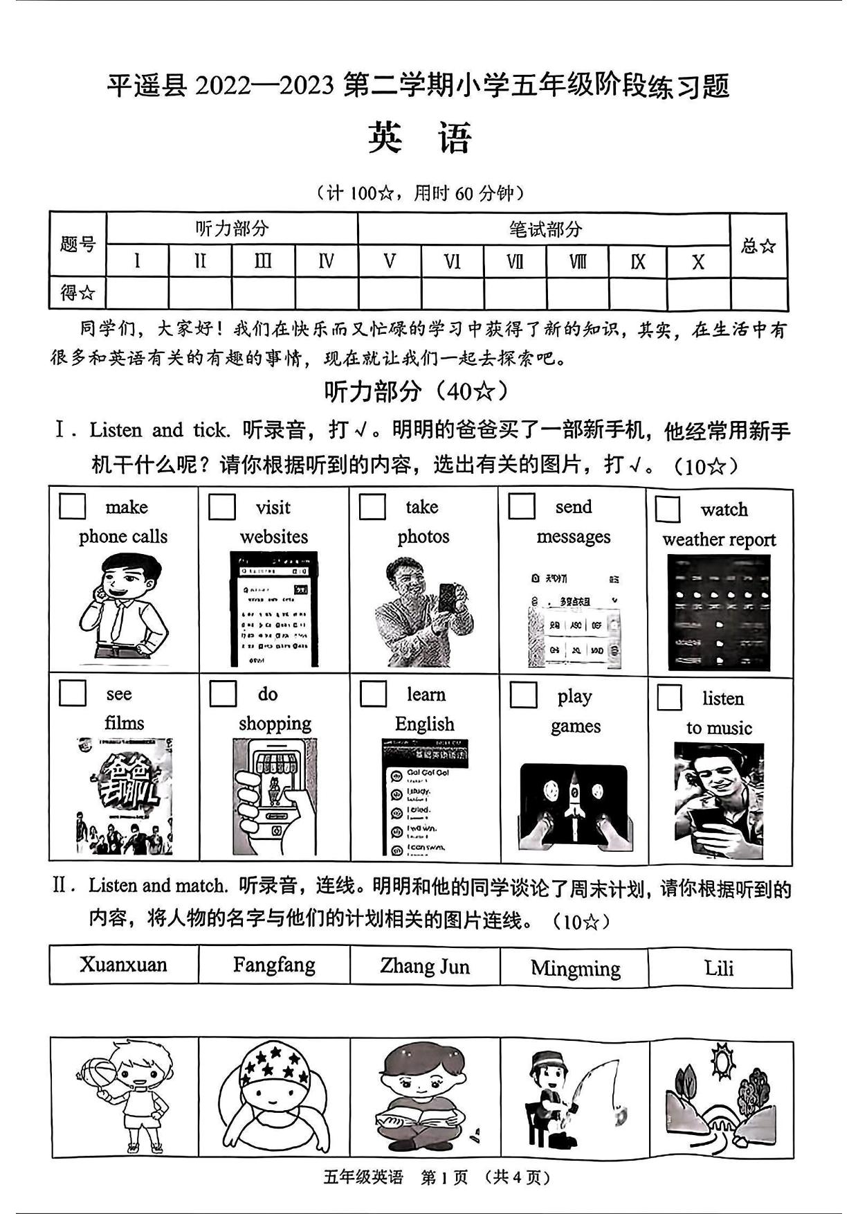 山西省晋中市平遥县2022-2023学年第二学期小学五年级英语期中阶段练习题(剑桥版)【无听力音频】