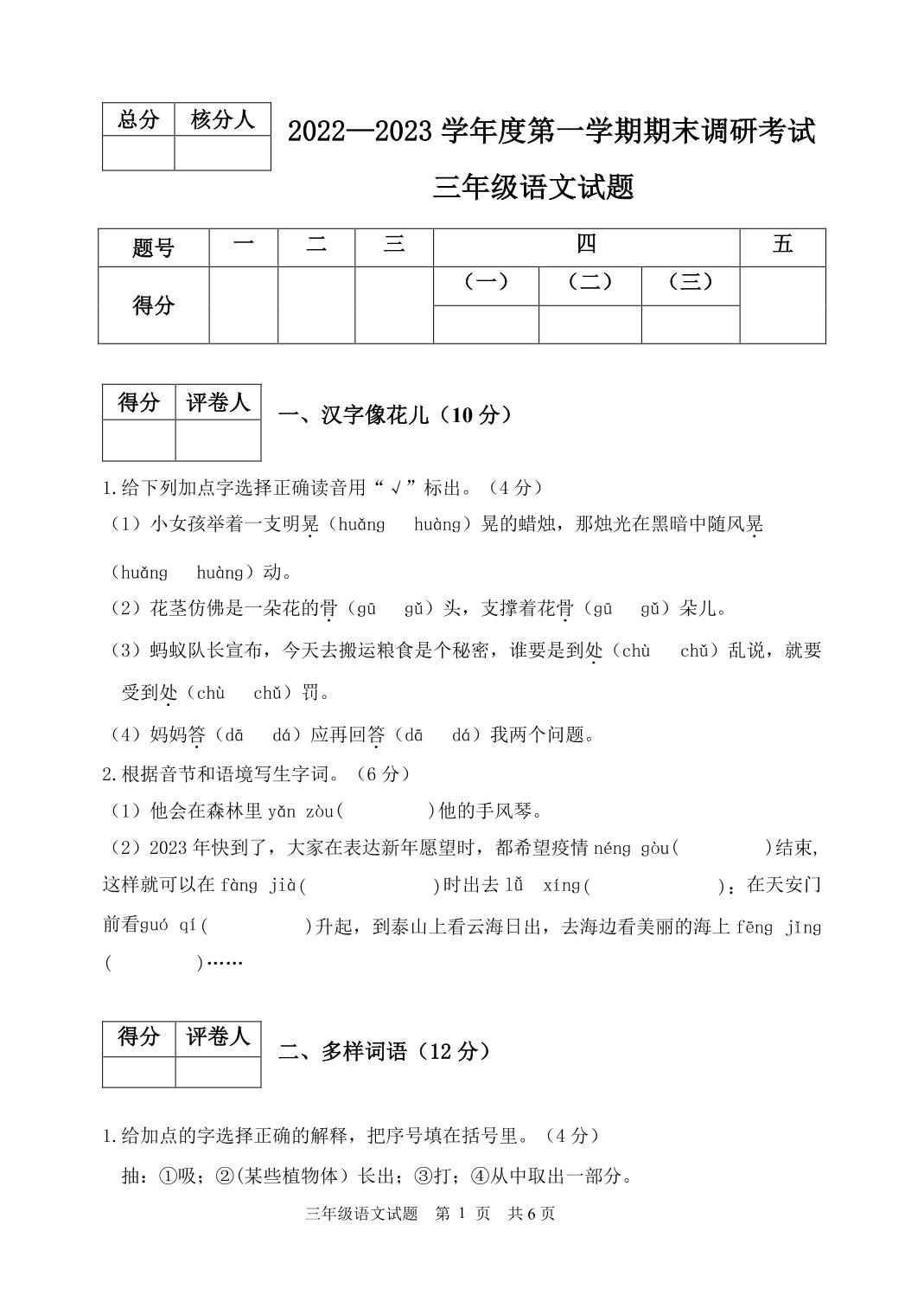 河北省保定市安新县2022-2023学年度第一学期期末调研考试试题三年级语文(人教版)