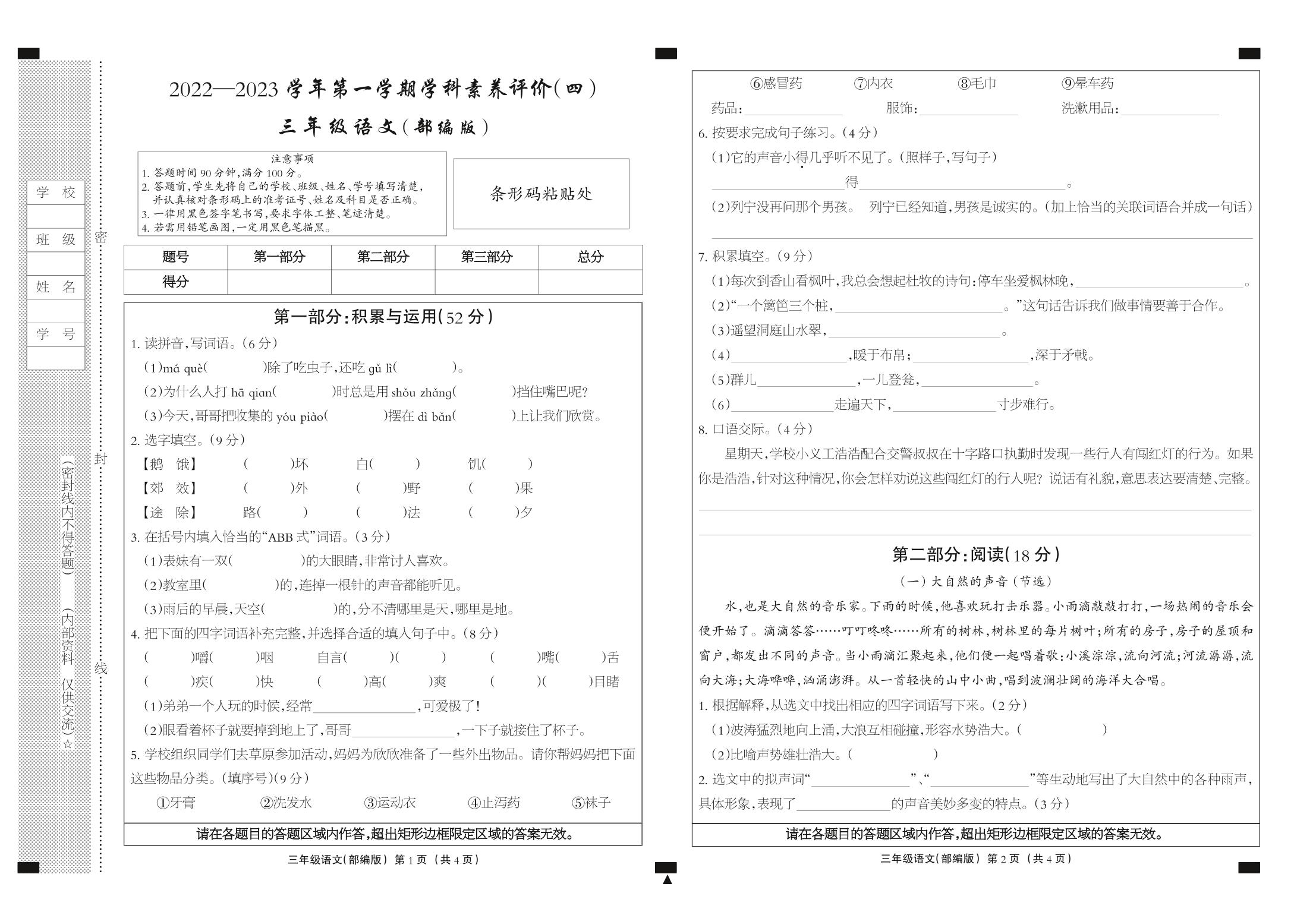 河北省衡水市深州市2022-2023学年第一学期学科素养评价(四)三年级语文(人教版)