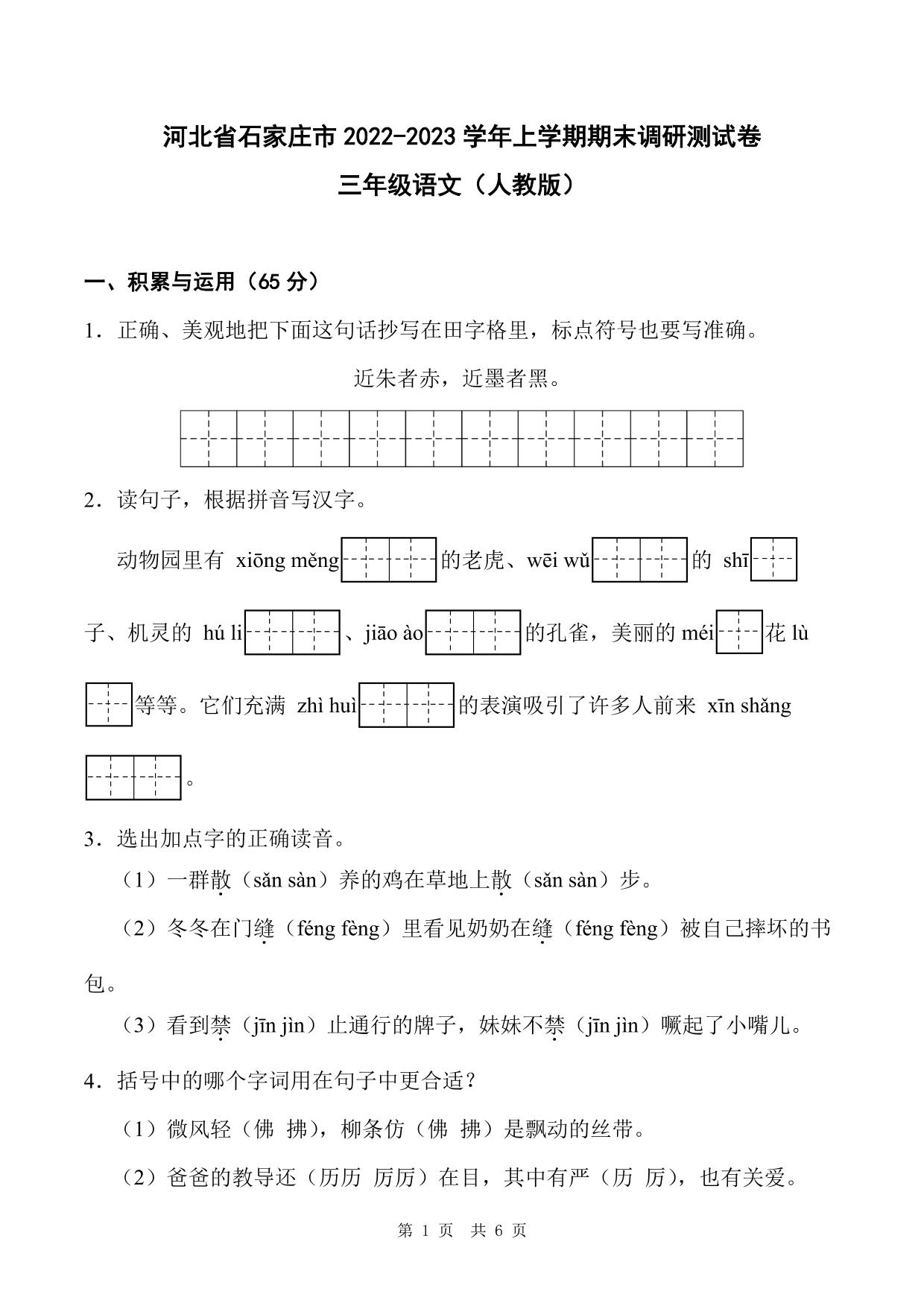 河北省石家庄市2022-2023学年上学期期末调研测试卷三年级语文(人教版)