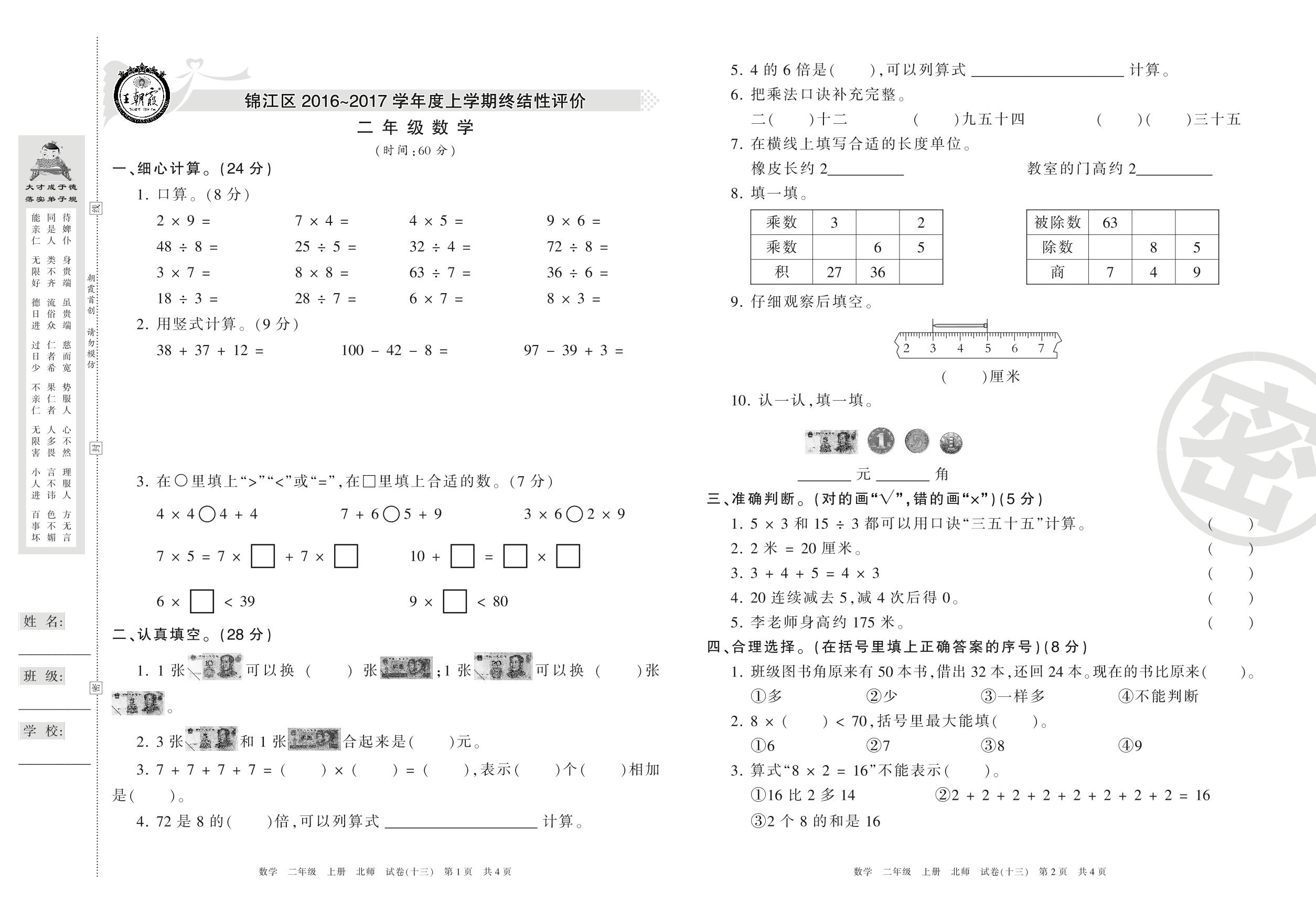 2016-2017学年第一学期成都市锦江区二年级数学试卷(北师版)【13】