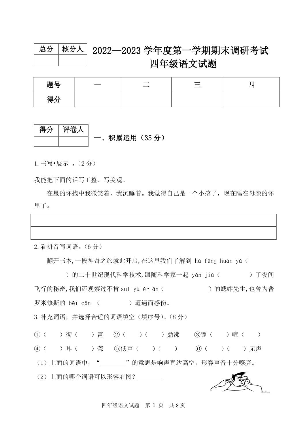 河北省保定市安新县2022-2023学年度第一学期期末调研考试试题四年级语文(人教版)