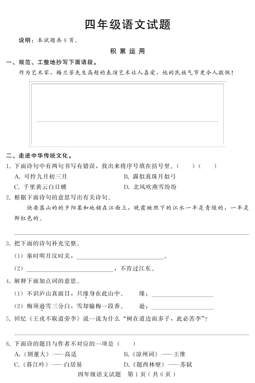 河北省承德市双滦区2022-2023学年上学期期末考试试题四年级语文(人教版)