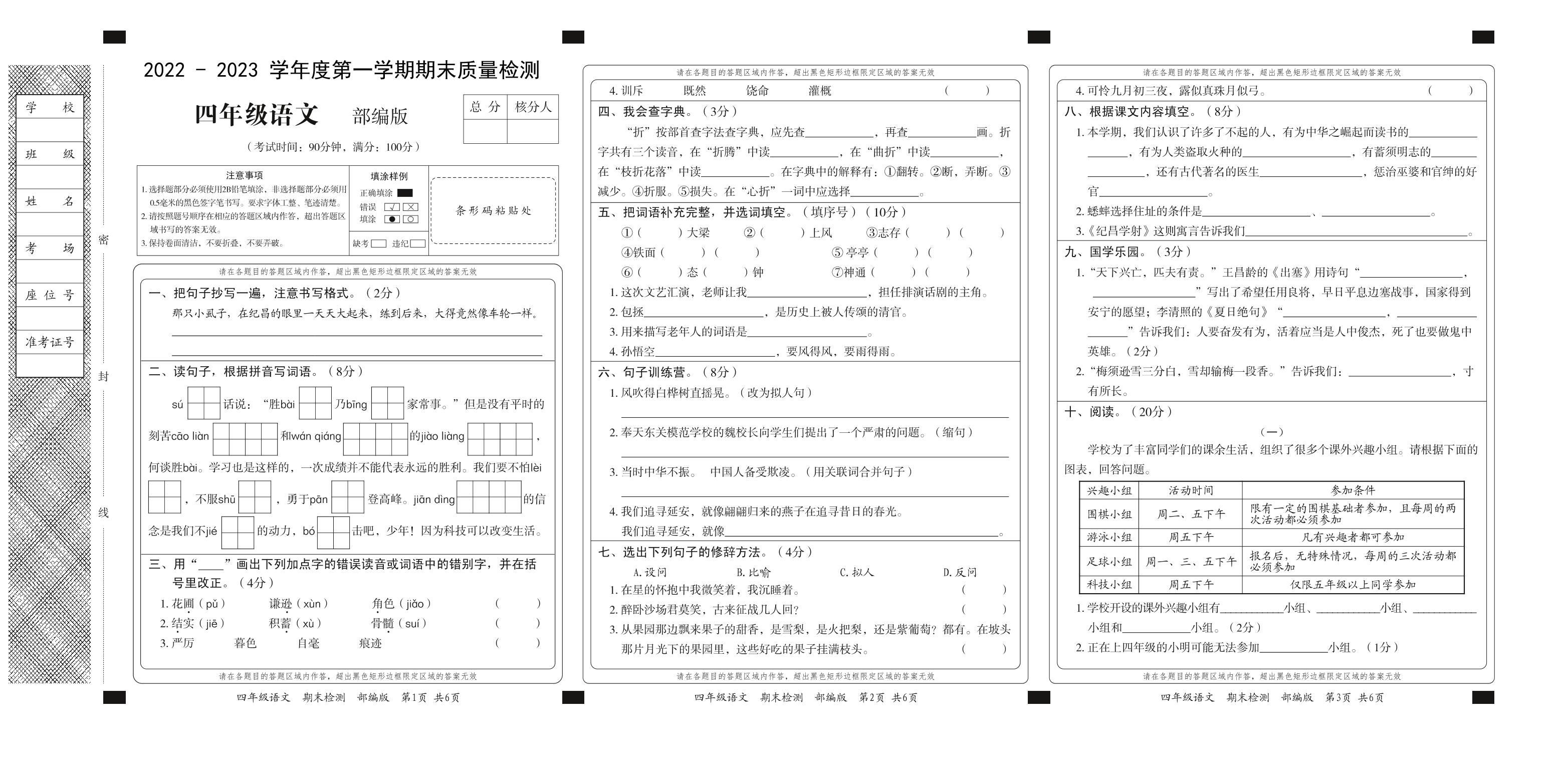 河北省邢台市威县2022-2023学年度第一学期期末质量检测四年级语文(人教版)