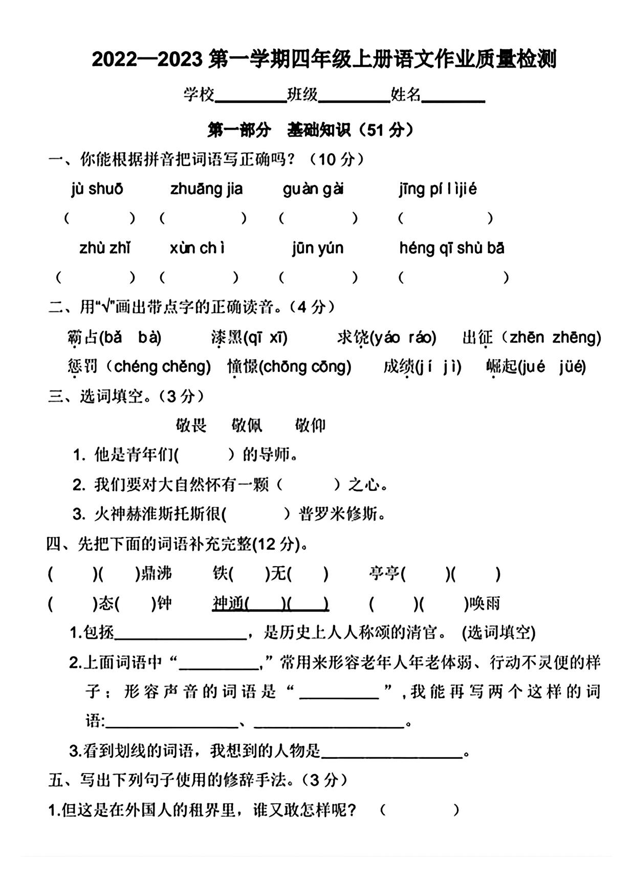 河北省保定市蠡县2022-2023学年第一学期作业质量检测四年级语文(人教版)