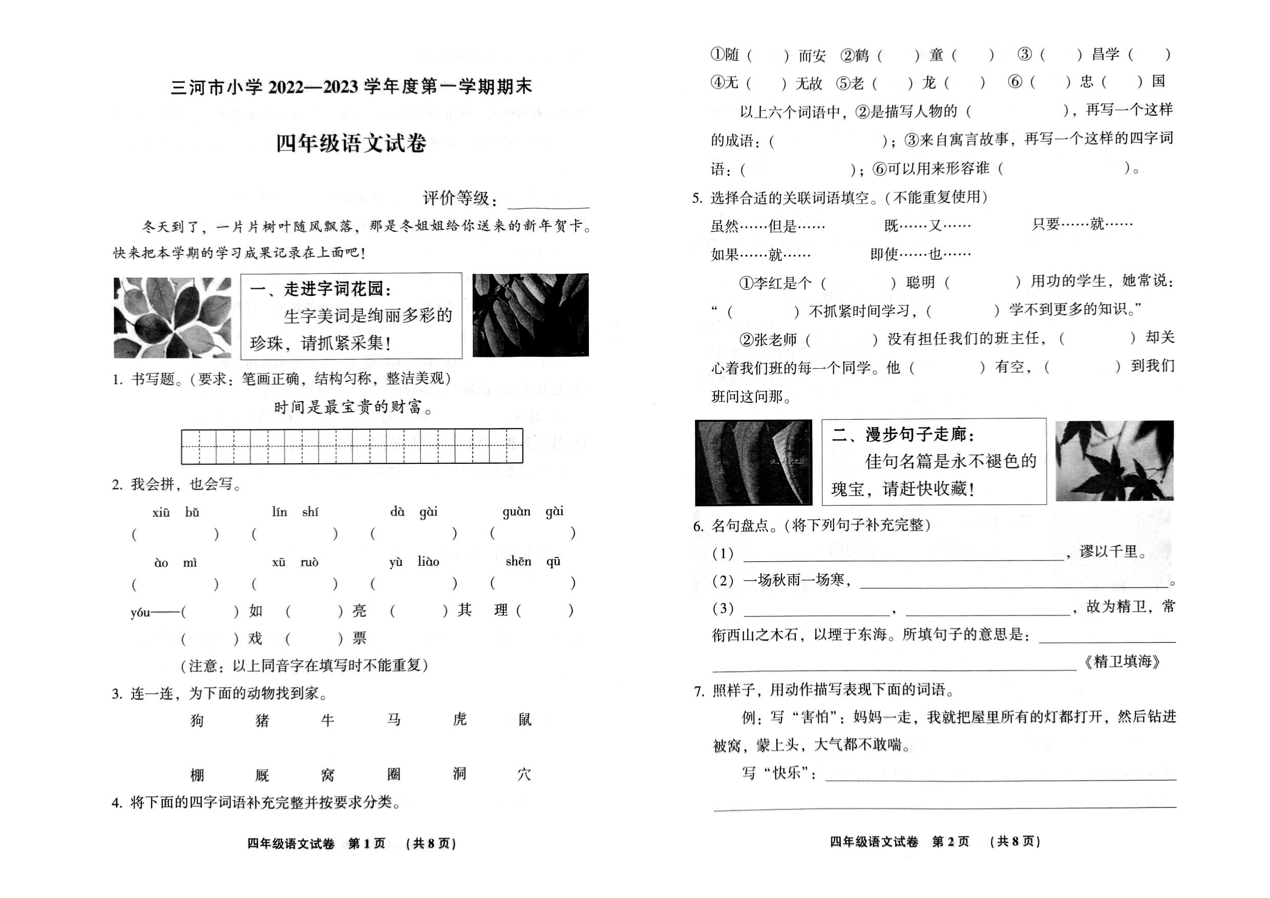 河北省廊坊市三河市2022-2023学年度第一学期期末试卷四年级语文(人教版)