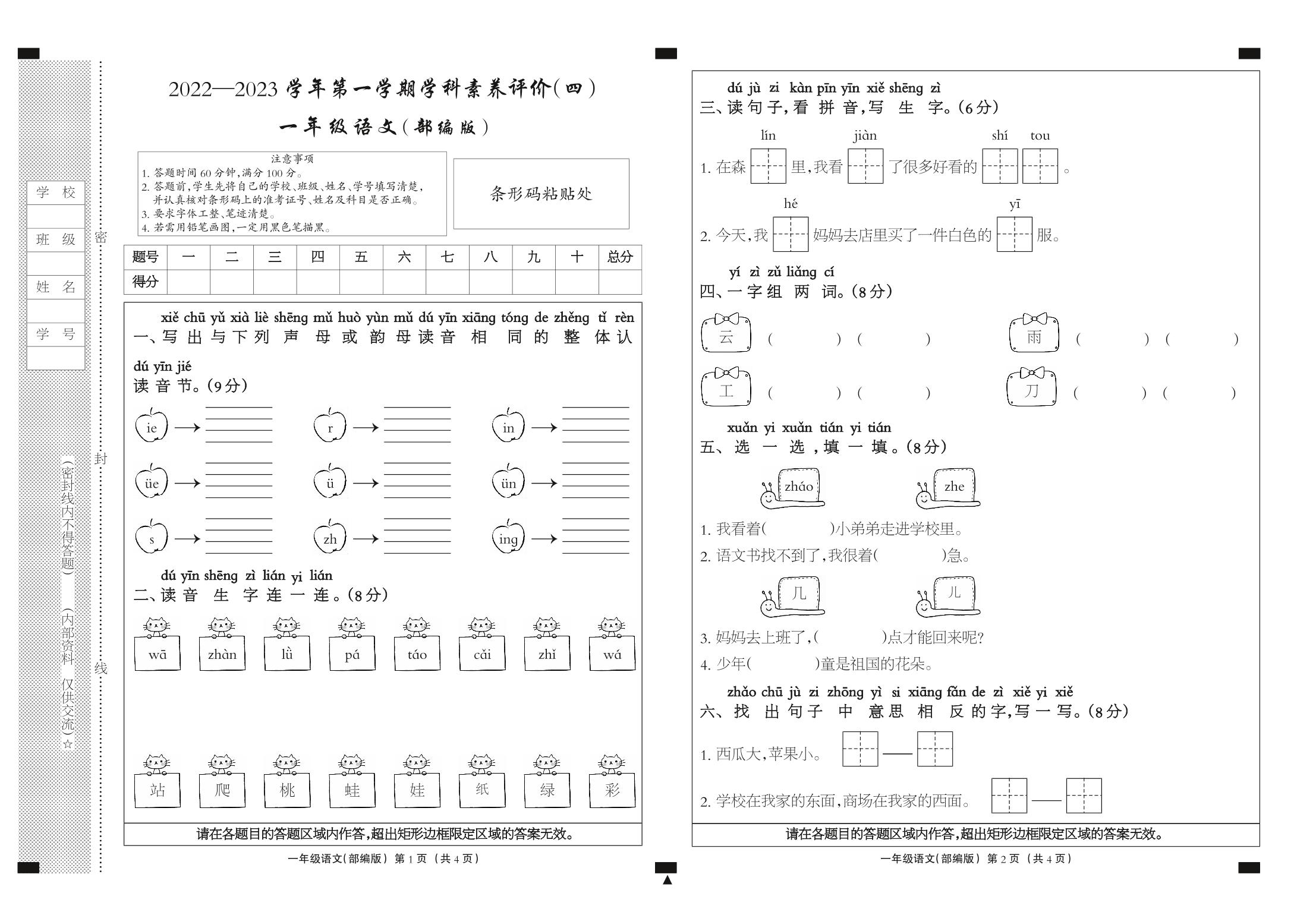 河北省衡水市深州市2022-2023学年第一学期学科素养评价(四)一年级语文(人教版)