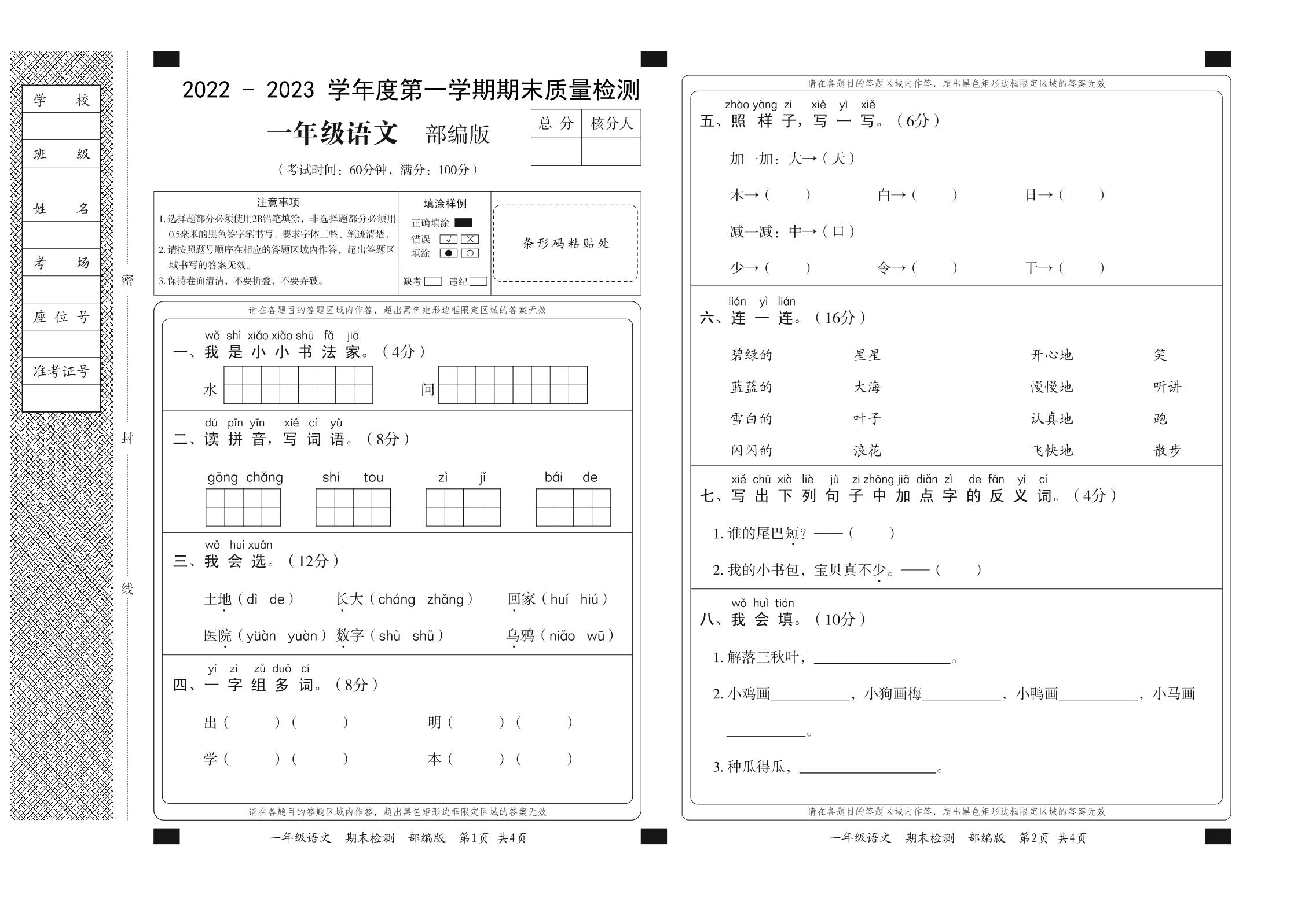 一年级语文人教版上册期末卷