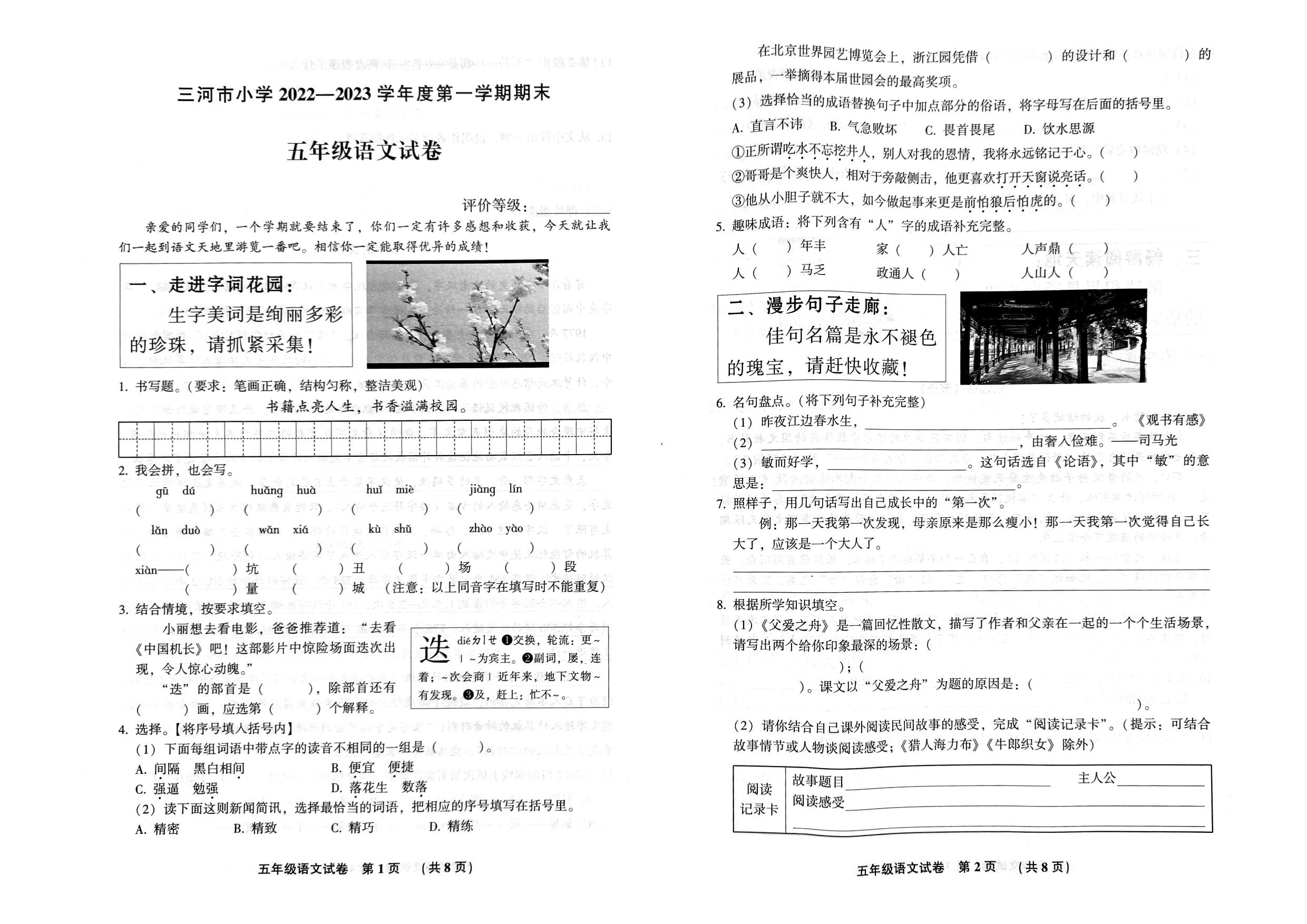 河北省廊坊市三河市2022-2023学年度第一学期期末试卷五年级语文(人教版)