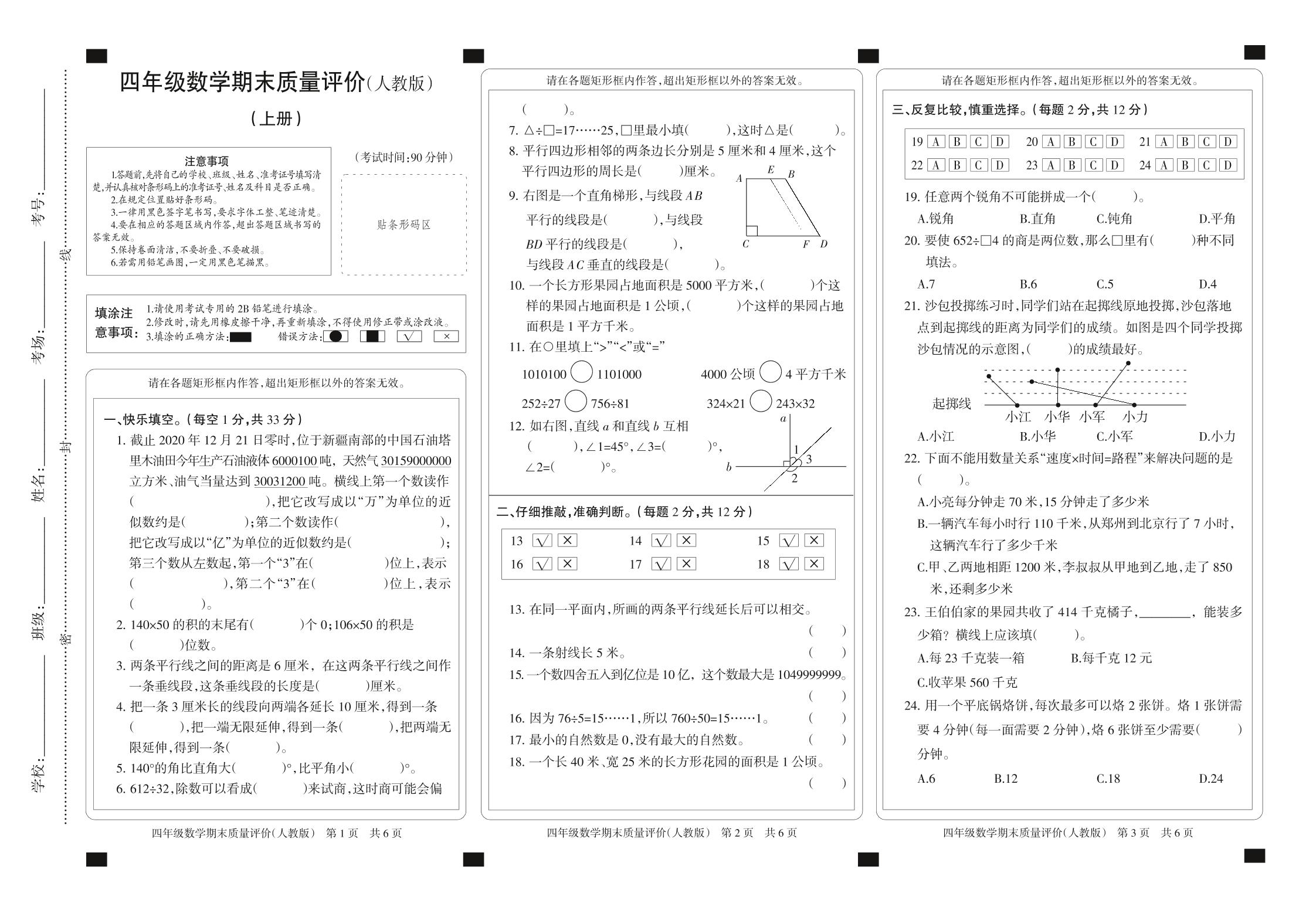 四年级数学人教版上册期末卷