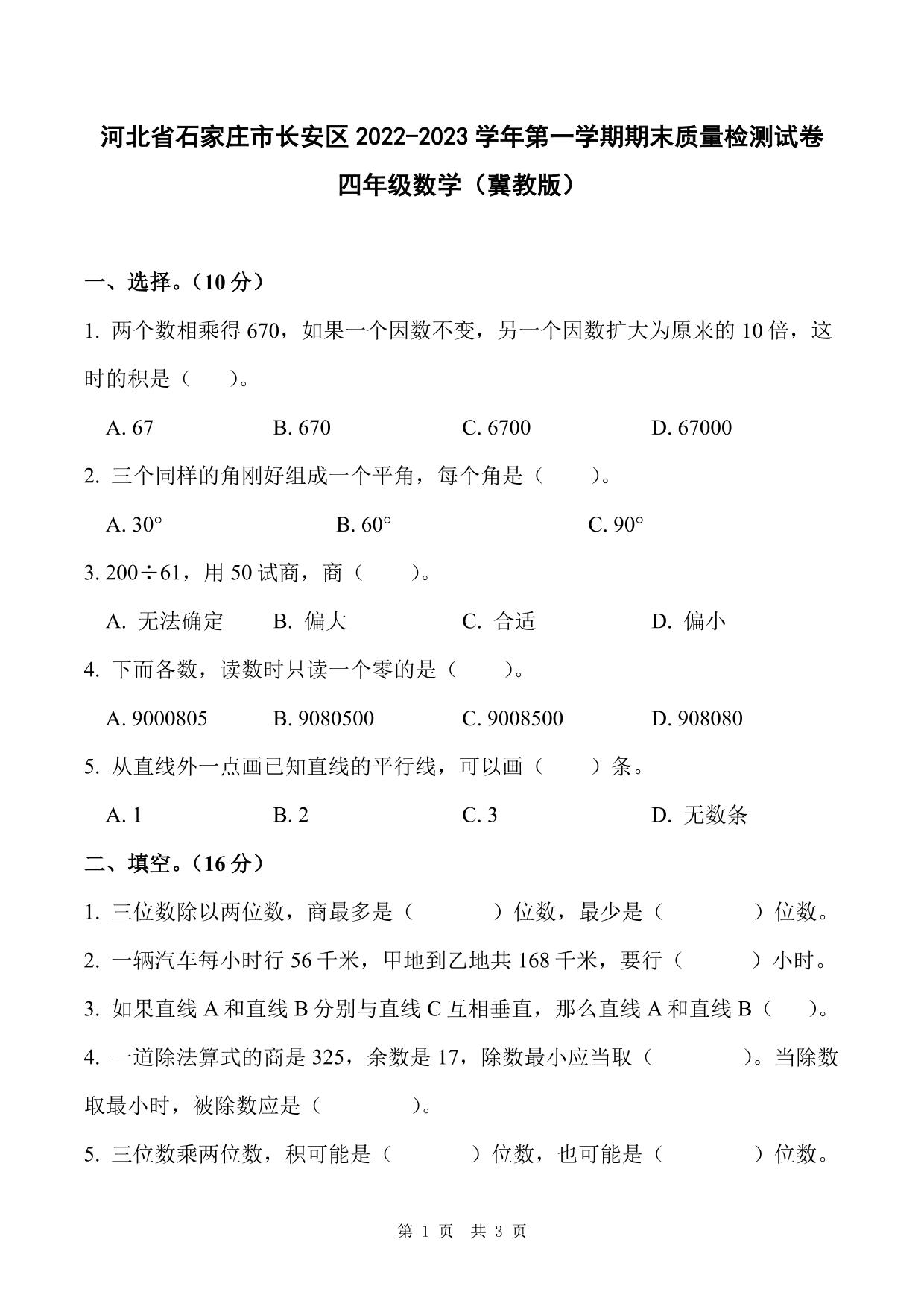 河北省石家庄市长安区2022-2023学年第一学期期末质量检测试卷四年级数学(冀教版)