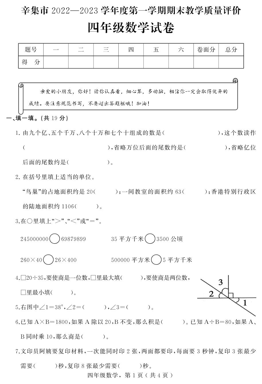 河北省石家庄市辛集市2022-2023学年度第一学期期末教学质量评价四年级数学(人教版)