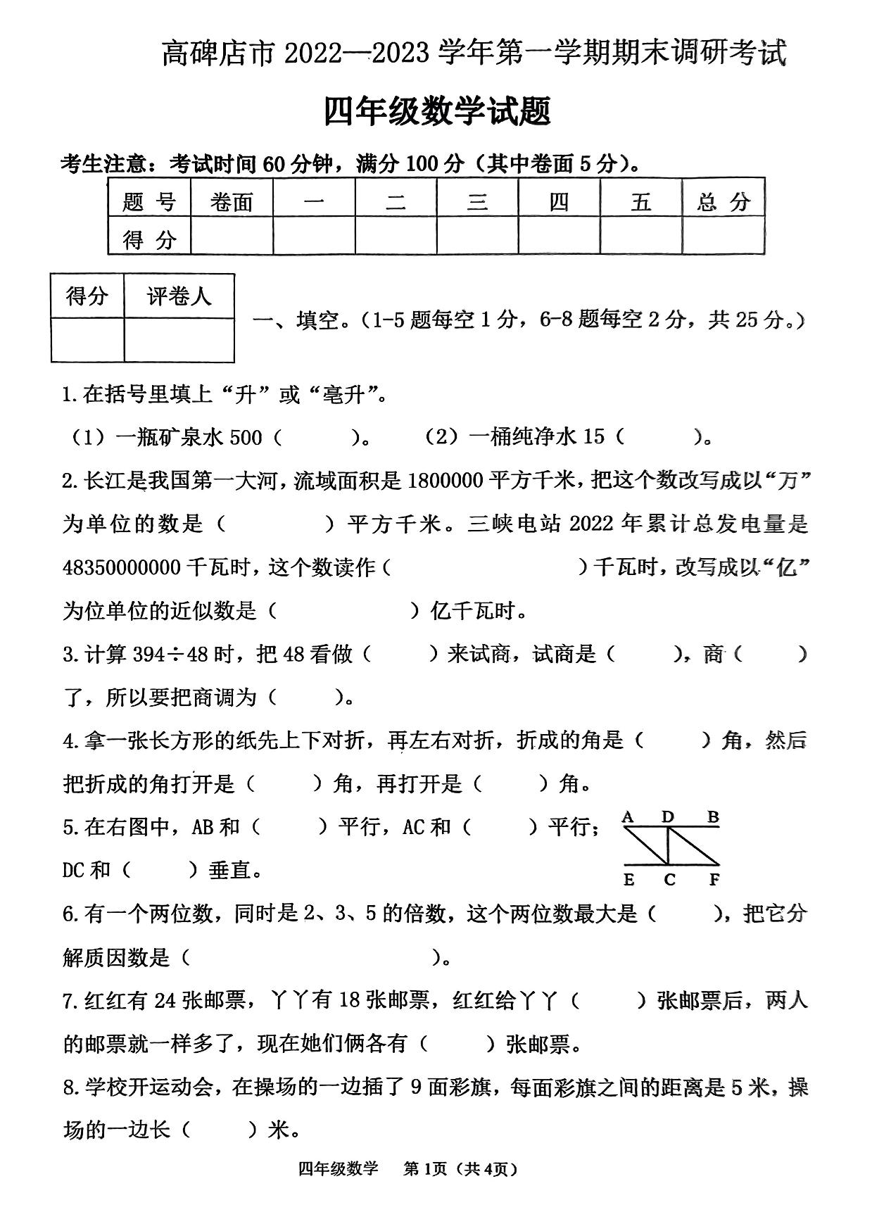 四年级数学冀教版上册期末卷