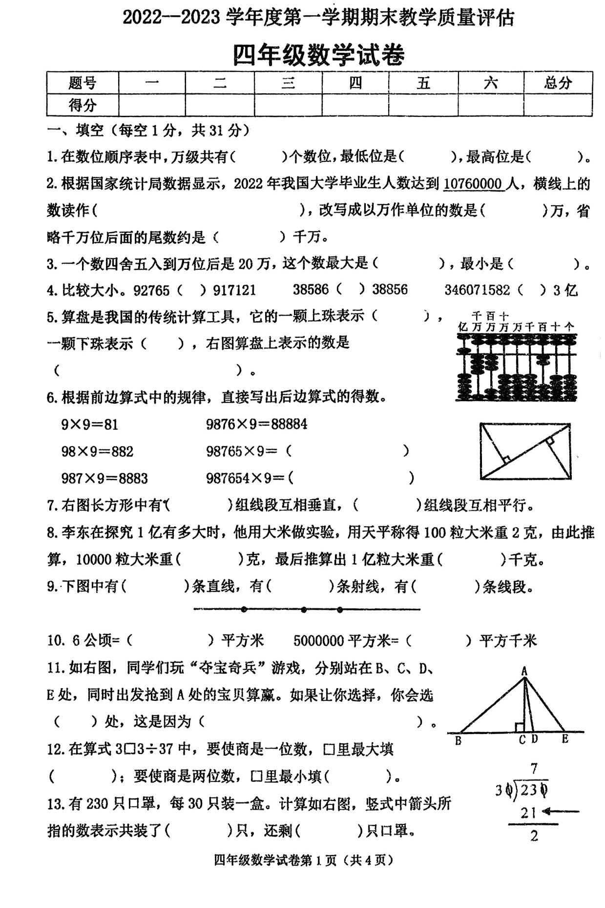 河北省沧州市黄骅市2022-2023学年度第一学期期末教学质量评估试卷四年级数学(人教版)