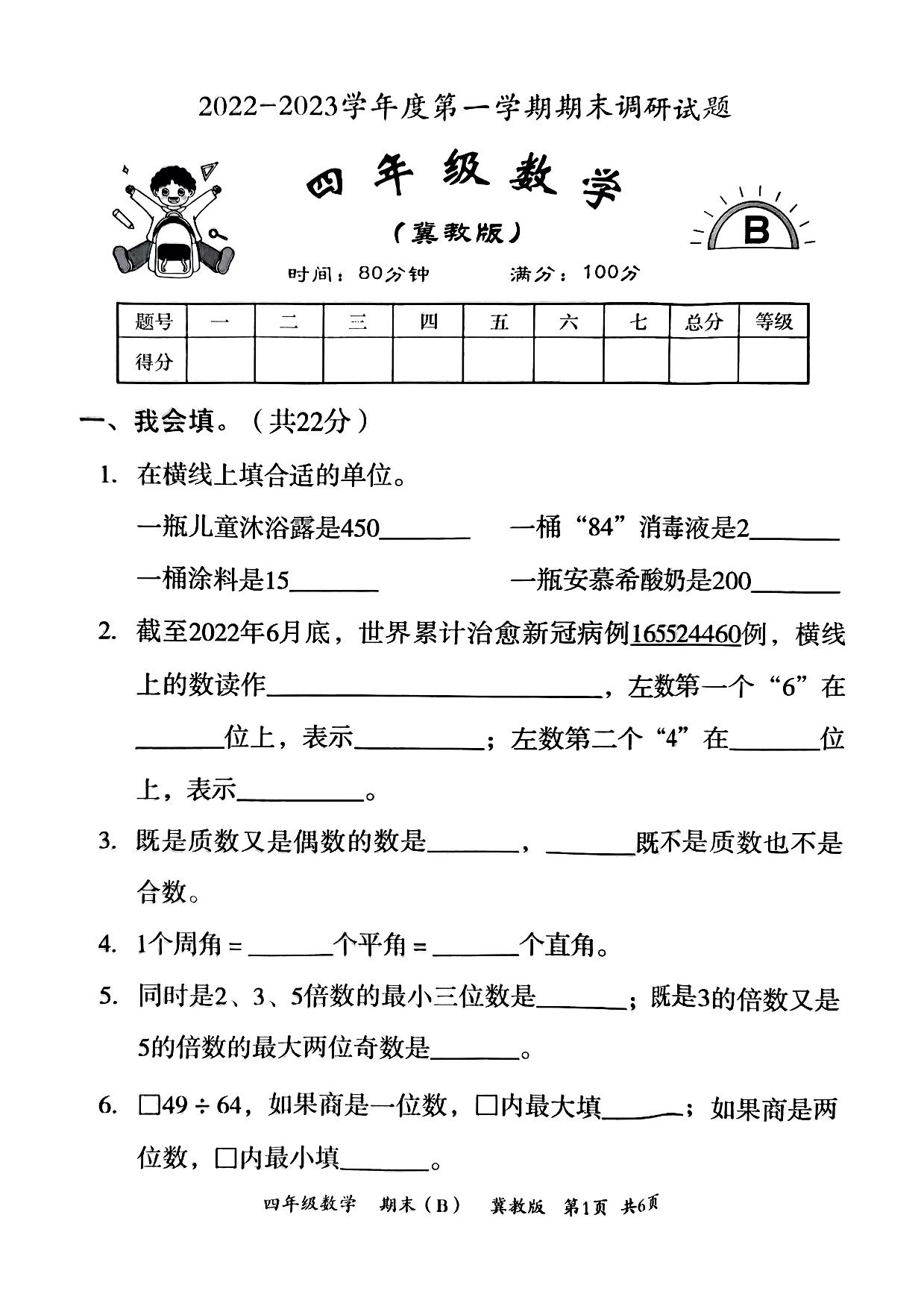 四年级数学冀教版上册期末卷