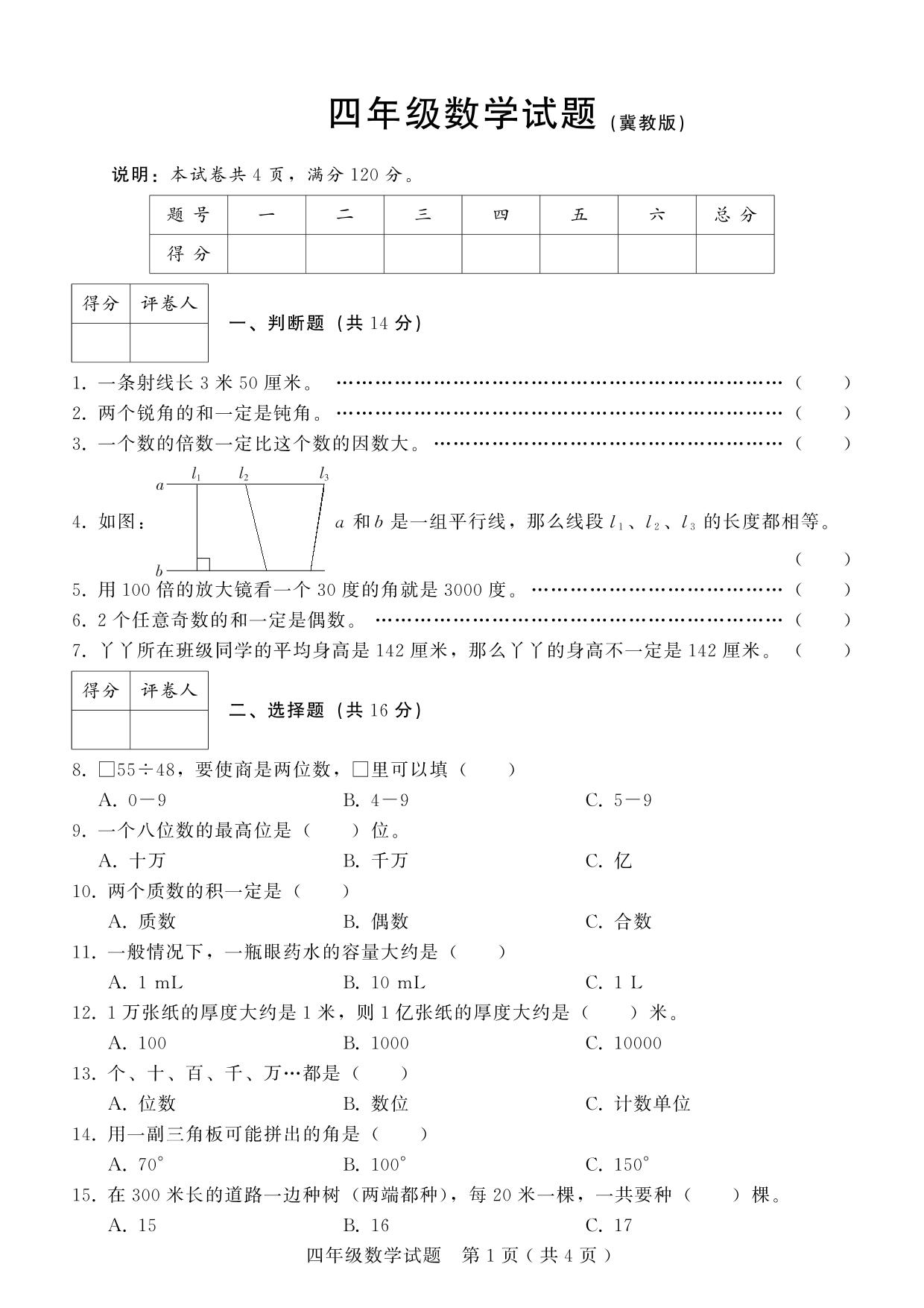 河北省承德市双滦区2022-2023学年上学期期末考试试题四年级数学(冀教版)