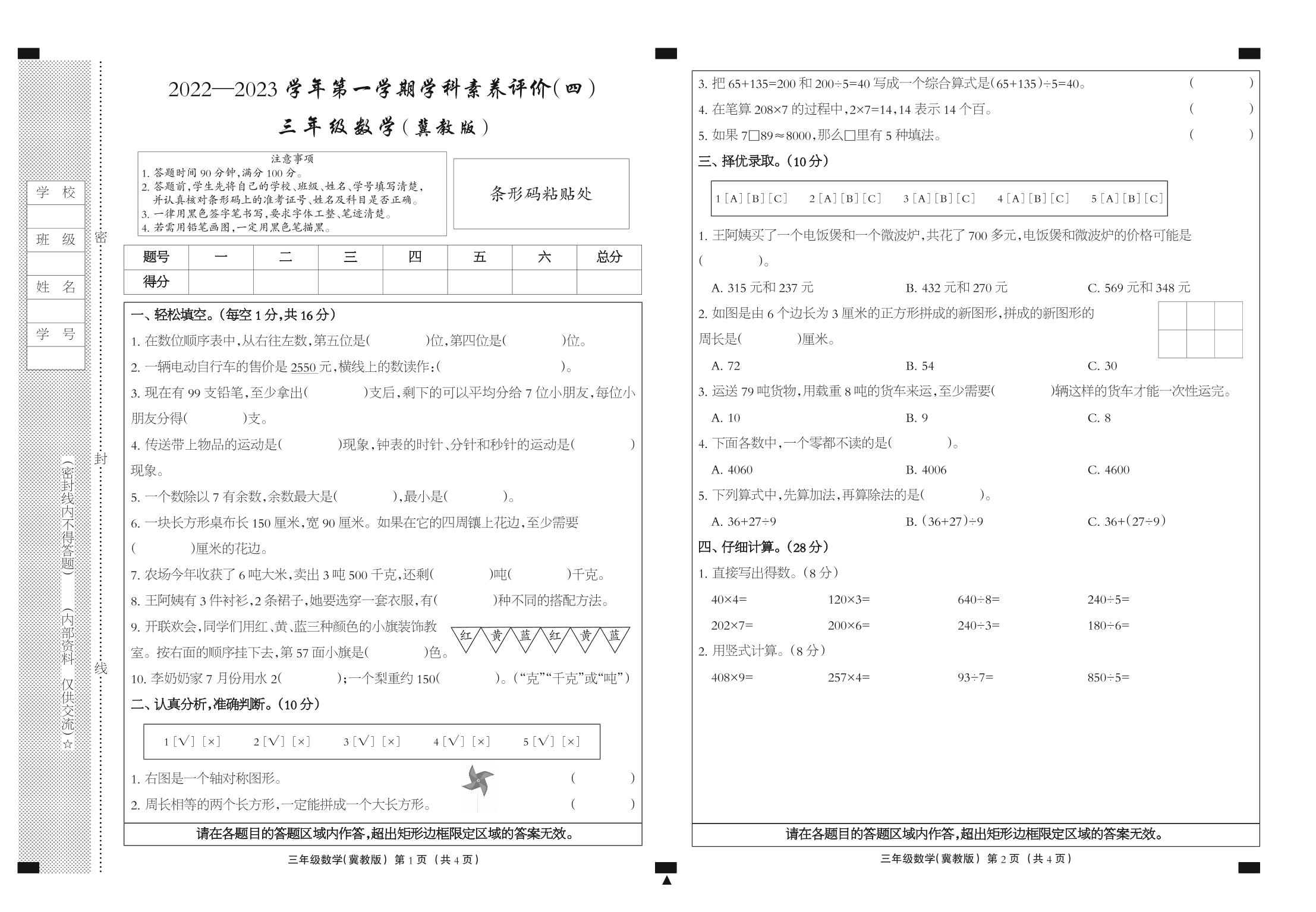三年级数学冀教版上册期末卷